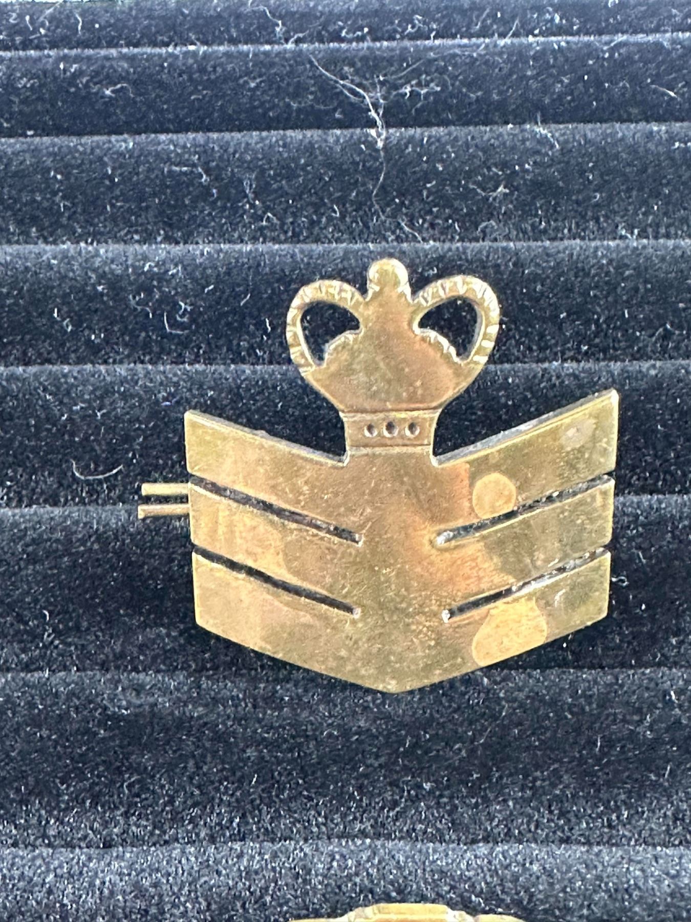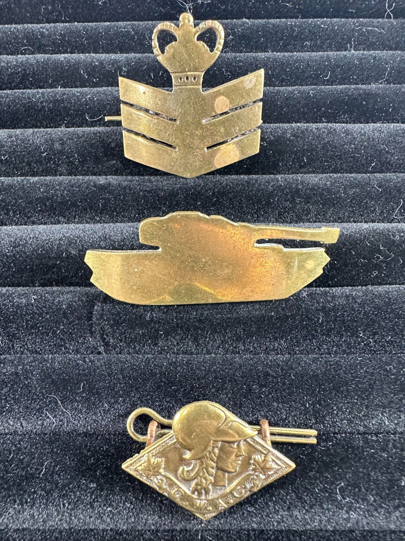 Group of three vintage brass military cap badges, including a crowned rank insignia, tank corps badge, and women's service emblem. Likely mid 20th century Canadian examples. Condition: Good vintage patina with light wear.