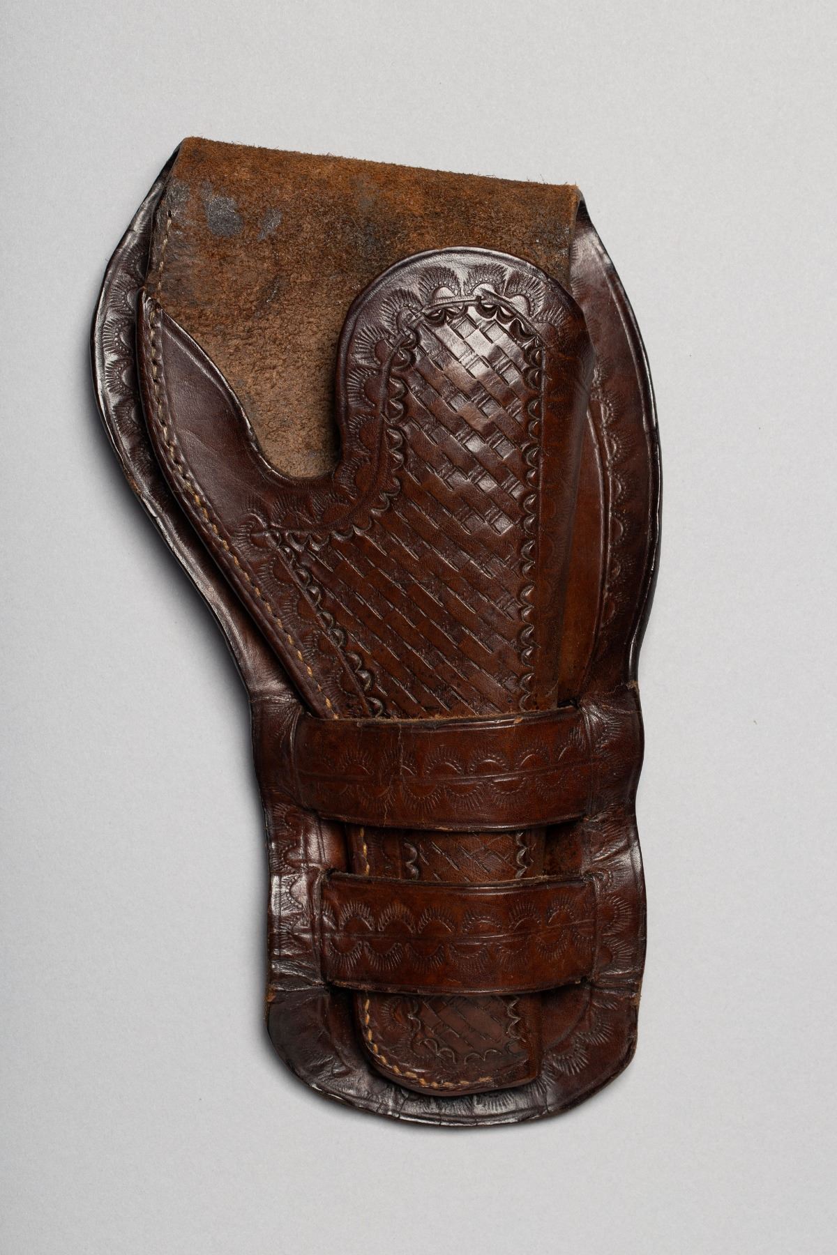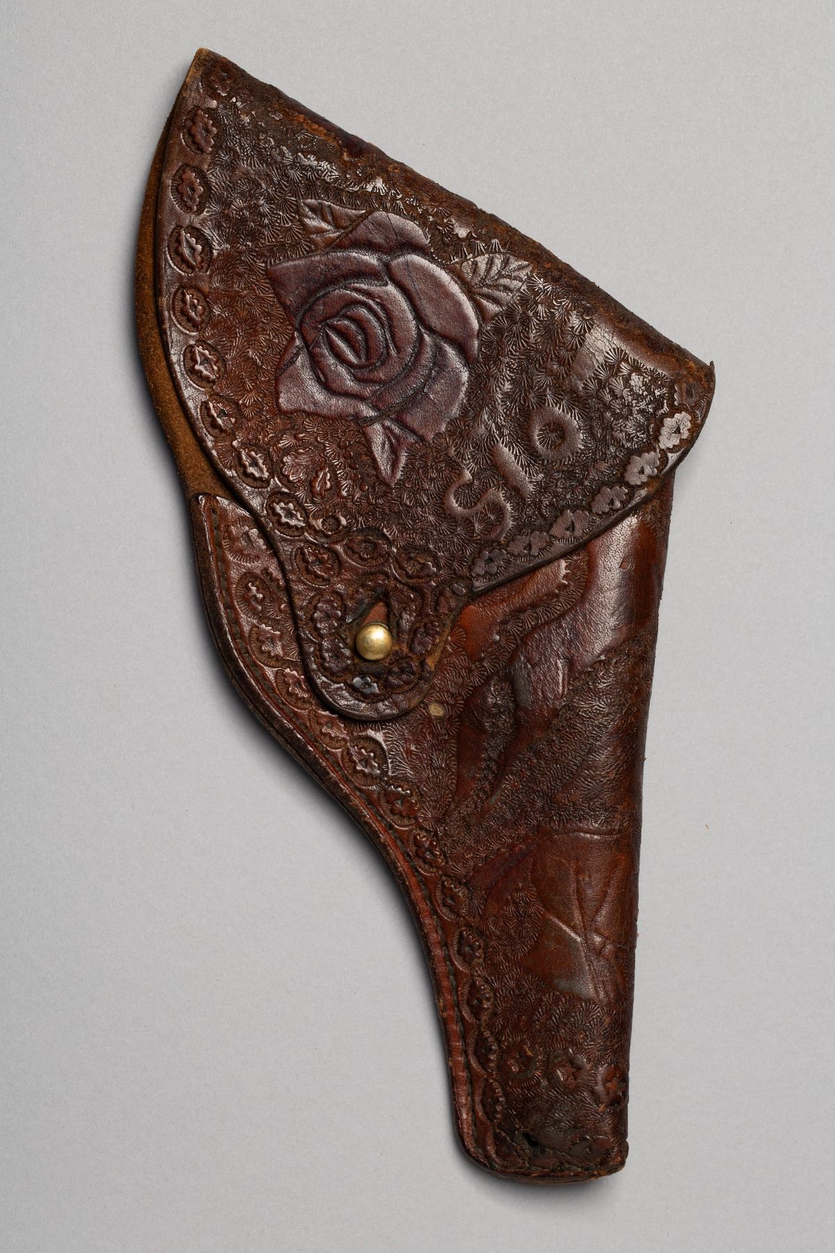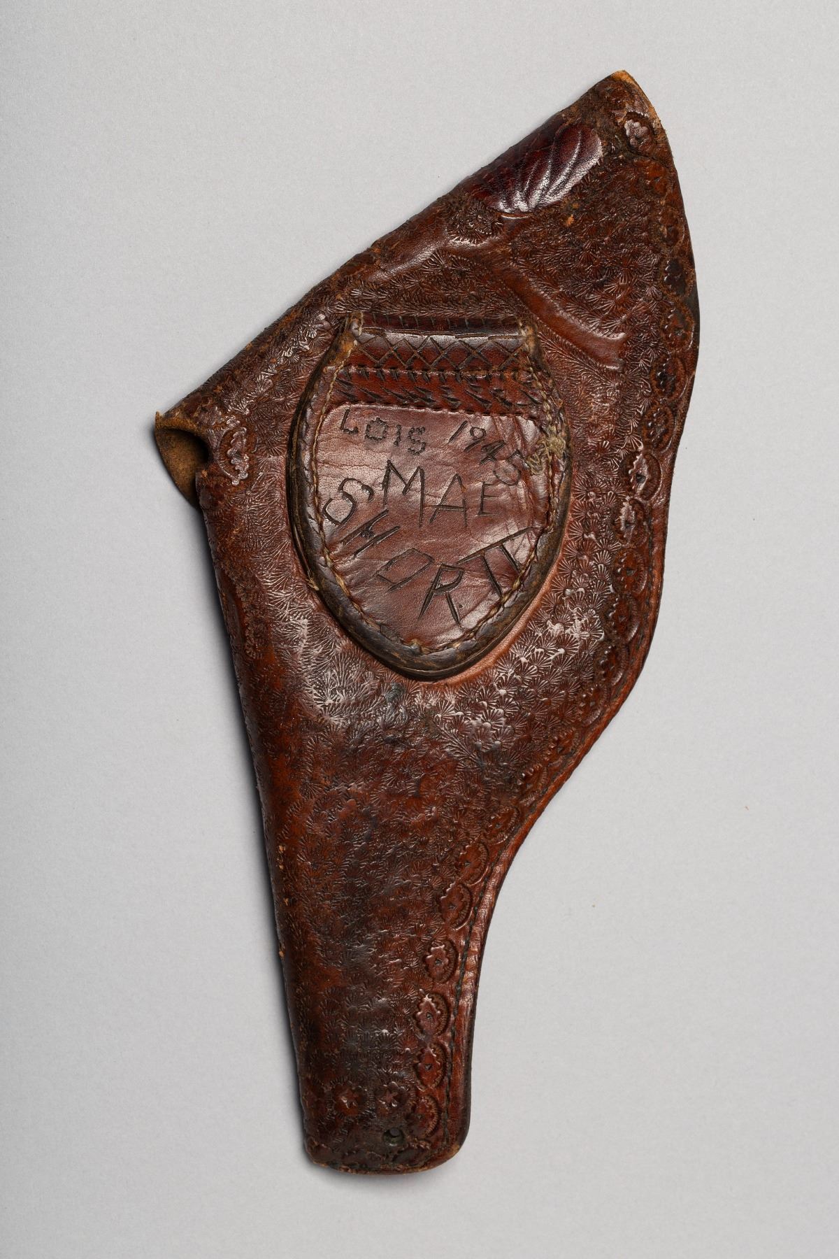 1) Tooling design of Cowboy on Horse, Deer, and intitials VA, 2) Floral tooling design with Rose, Horse, "S10", and "Lois 1945 Mae SHORTT" 3) Basket Weave design, Double Loop