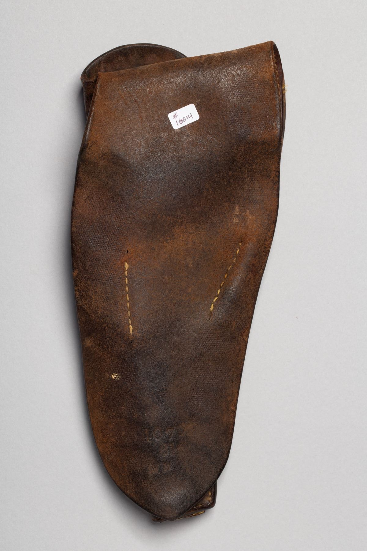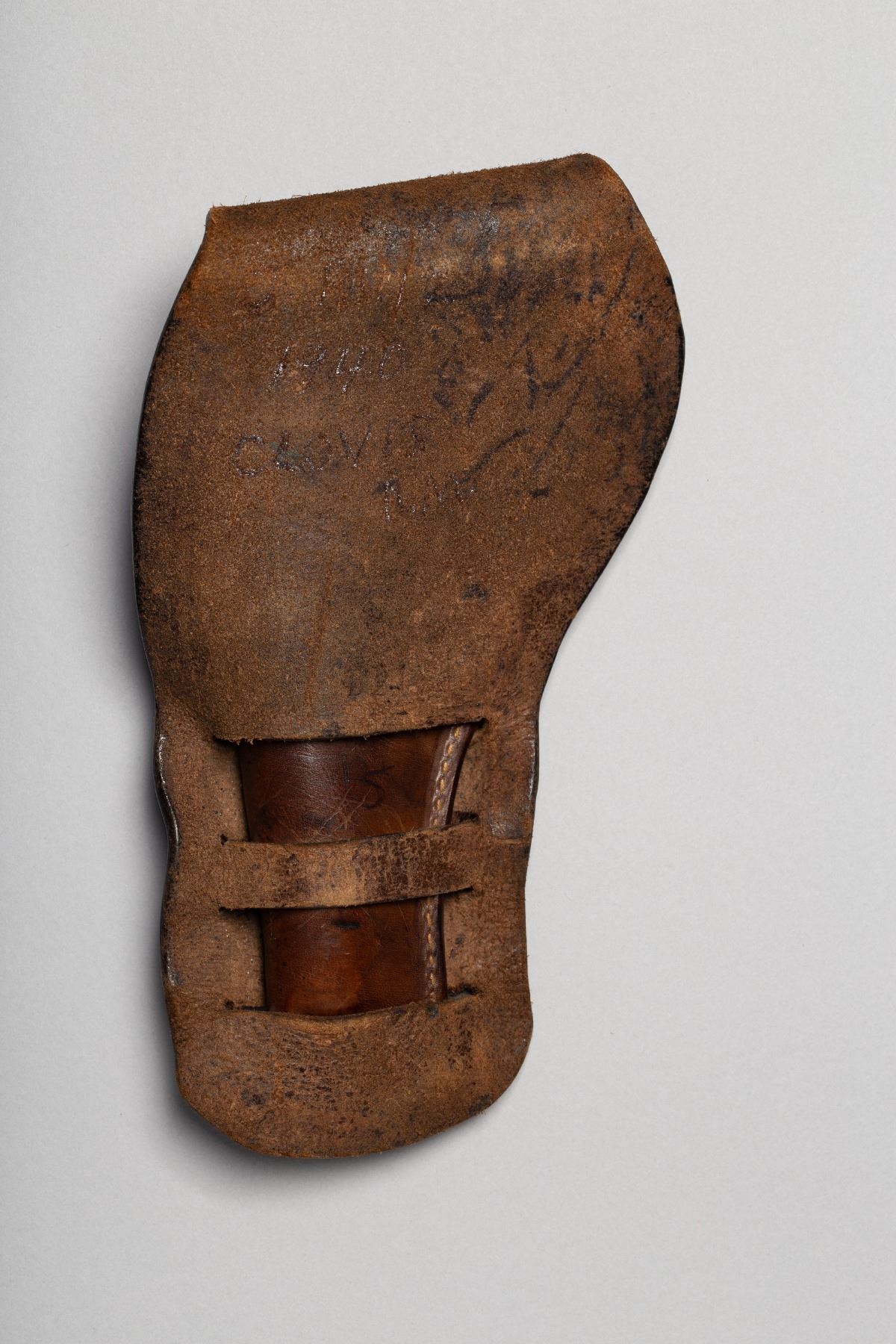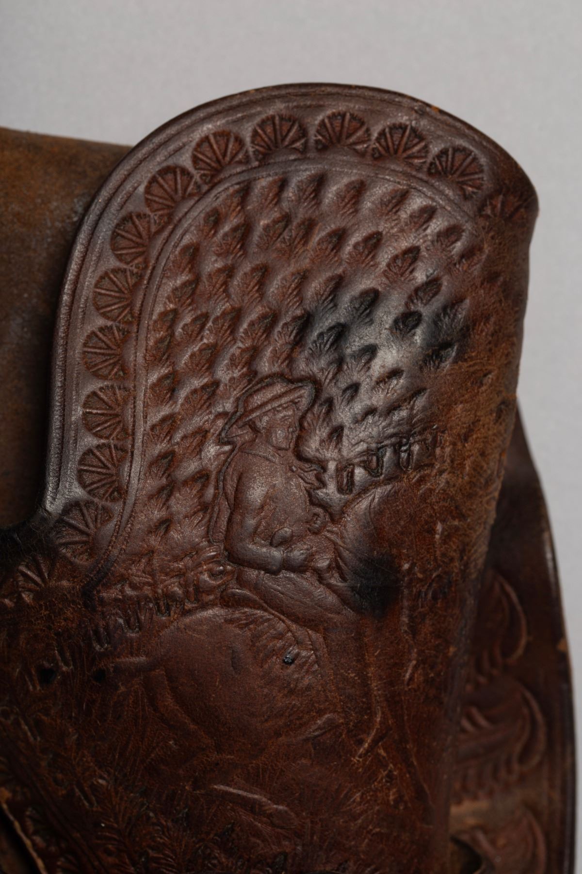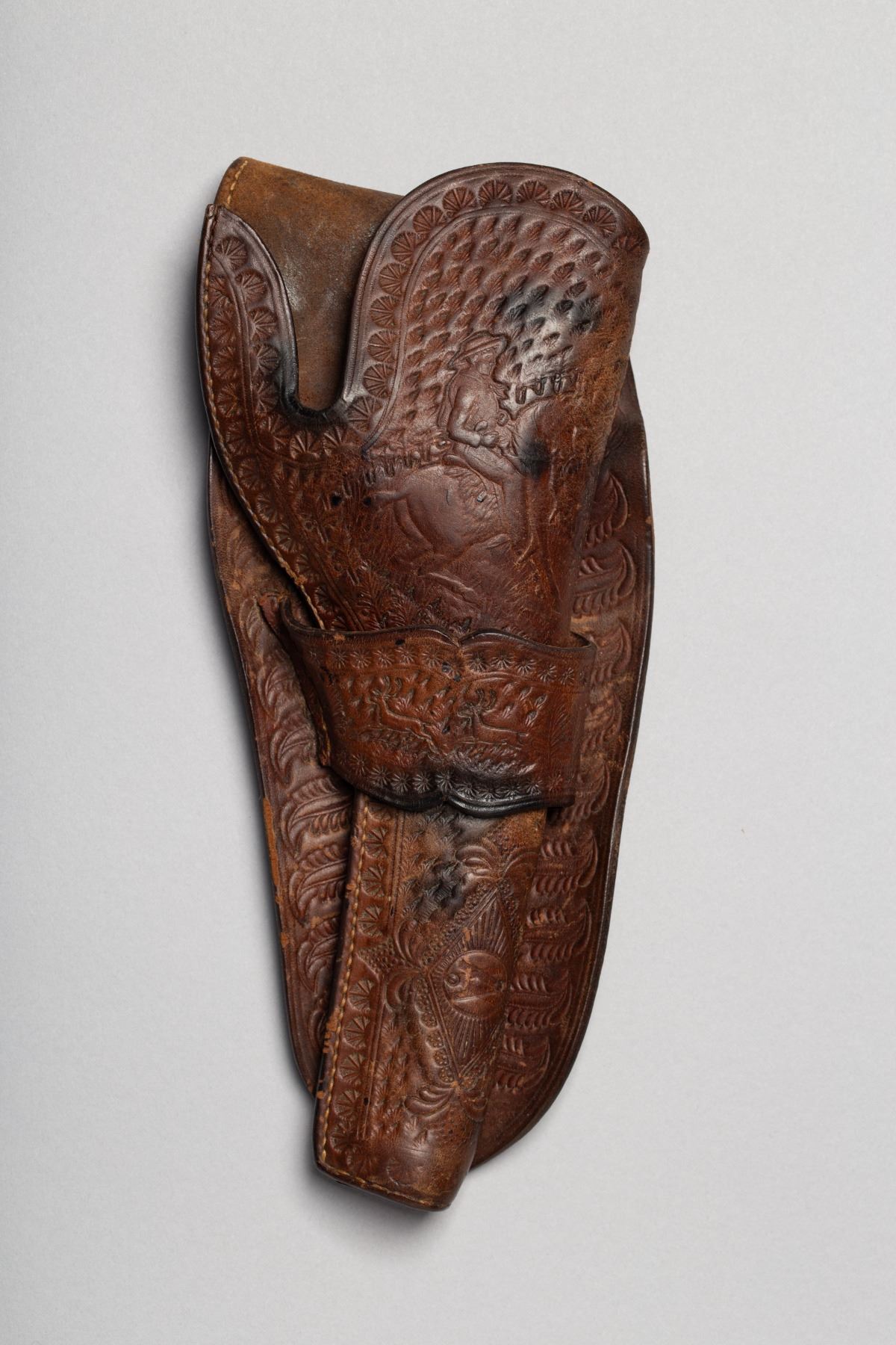 1) Tooling design of Cowboy on Horse, Deer, and intitials VA, 2) Floral tooling design with Rose, Horse, "S10", and "Lois 1945 Mae SHORTT" 3) Basket Weave design, Double Loop