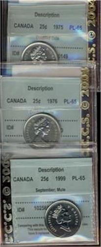 Lot of 3 CCCS graded Twenty-five cents; 1975 Doubled date, 1976 Doubled date, 1999 September MULE. All PL65.