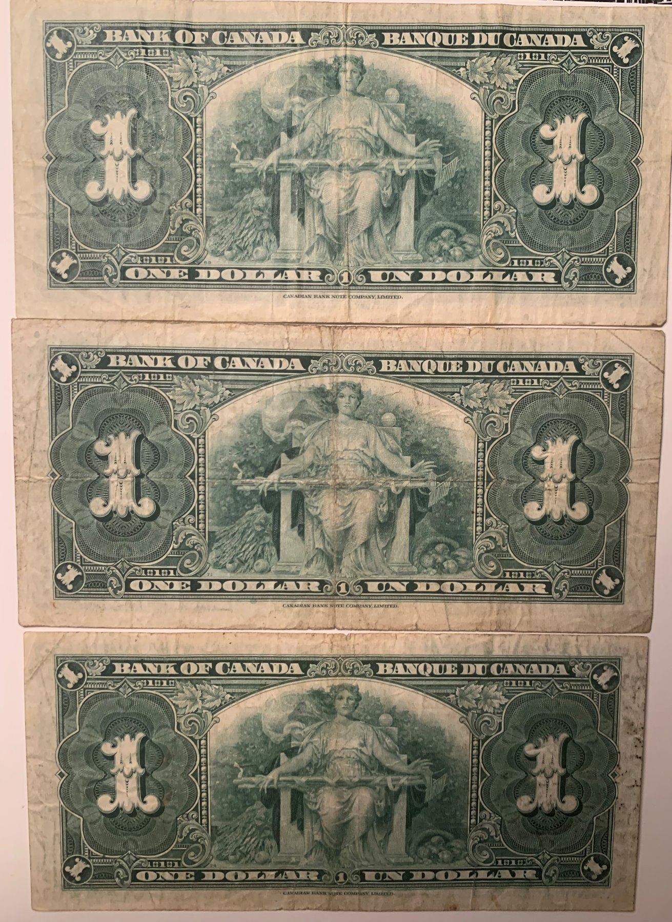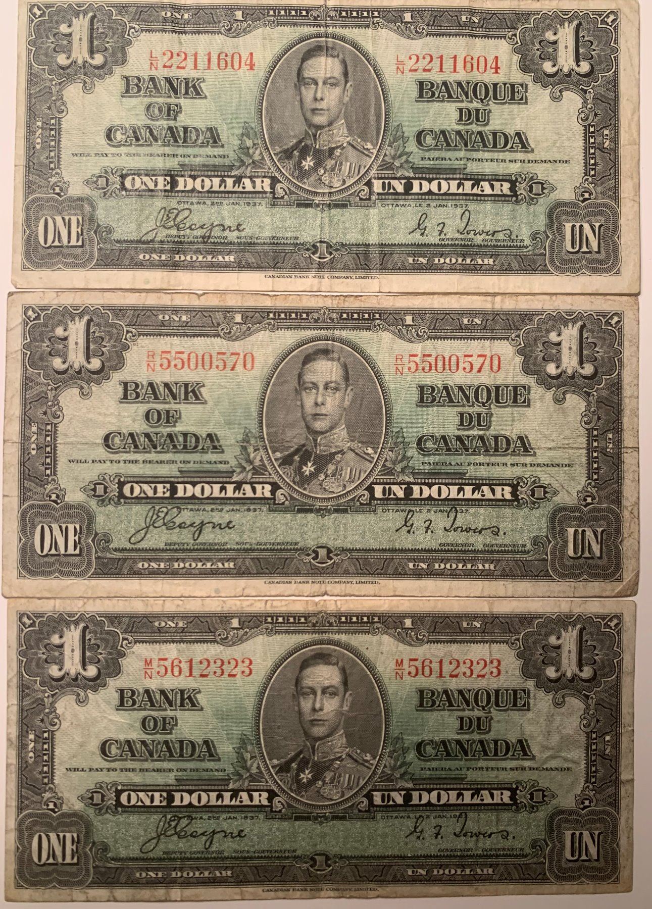 Lot of 3 Canada 1 Dollar 1937 Bank of Canada $1 BC-21d Circulated