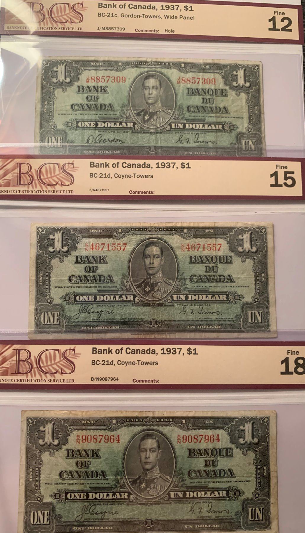 Lot of 3 Canada 1 Dollar 1937 Bank of Canada $1 BCS 12, BCS 15 and BCS 18 Fine