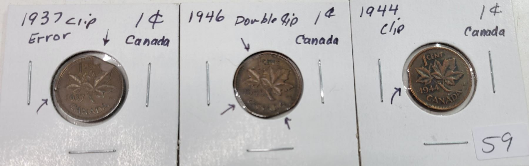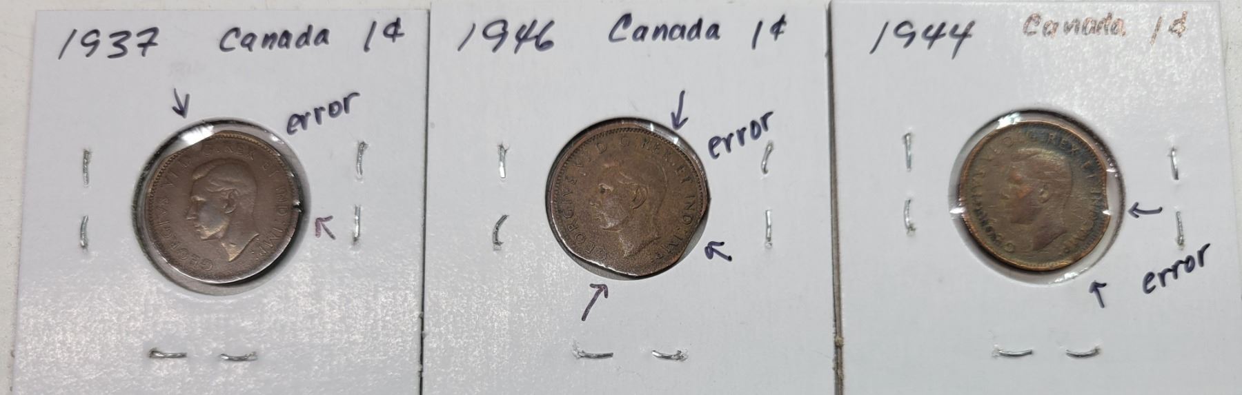 Lot of 3 Canada 1¢ Error Coins: 1937, 1944, 1946