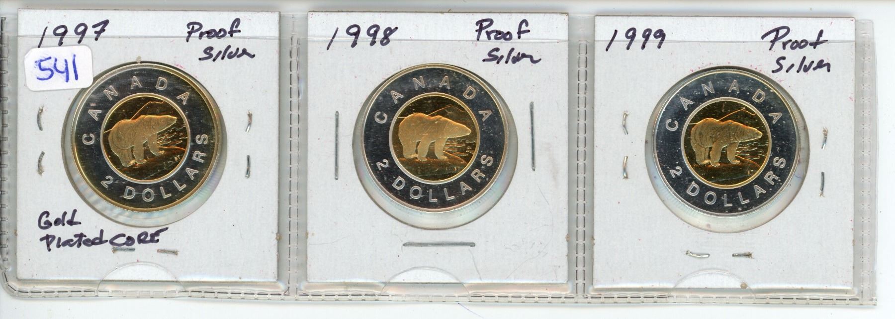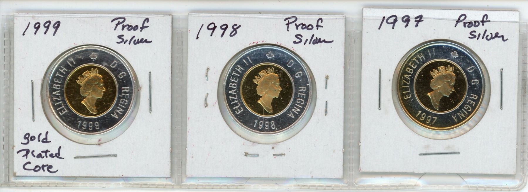 Lot of 3 Canada Silver Proof $2 Coins: 1997-99; gold-plated core