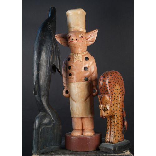 Lot of 3, Carved Wooden Figures Pig 38 " tall Dolphin 39 " tall and a Leopard 21 " tall