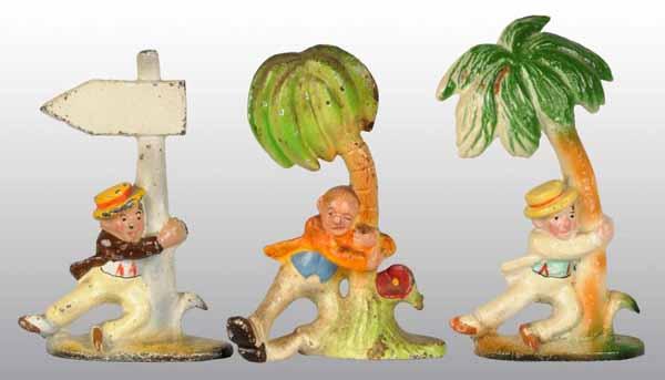Description Includes one Drunk with Straw Hat by Sign Post by John Wright, one Bald Drunk by Palm Tree by Wilton Products, and one Drunk with Straw Hat by Palm Tree by John Wright. Condition (Excellent). Size Largest: 4 - 1/4" x 2 - 1/2".