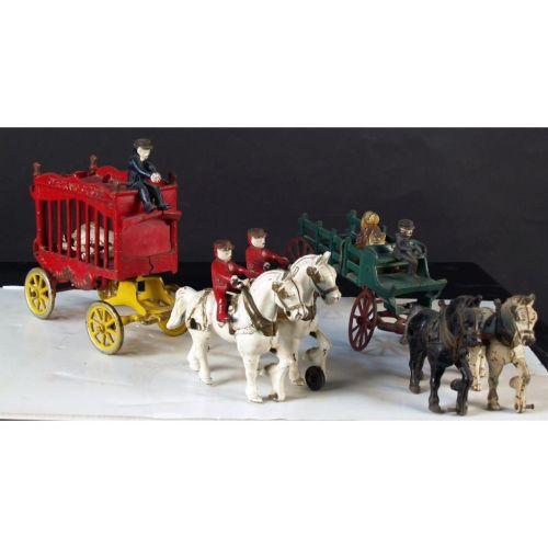 Lot of 3 Cast-Iron Toy Items 2 are Horses pulling wagons and 1 is a lead "Squirrel" Paperweight
