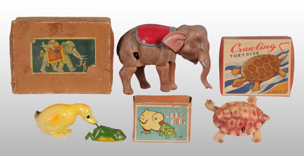 Description Japanese. Working. Includes one "Occupied Japan" crawling tortoise, one Jolly Duck toy depicting duck catching a frog, and one pre-war elephant missing tail with some broken out celluloid where key winds. Includes original boxes. Condition (Very Good - Excellent). Size Largest: 8" L.