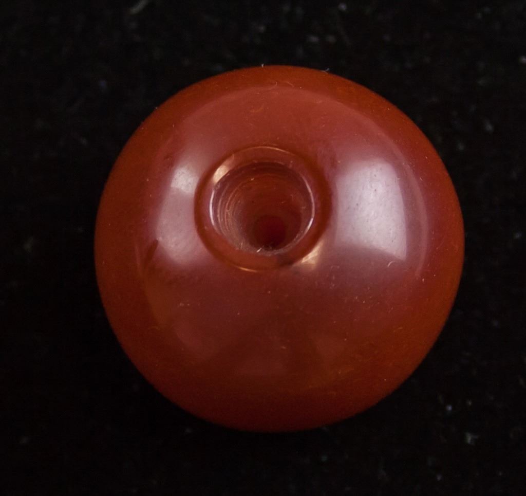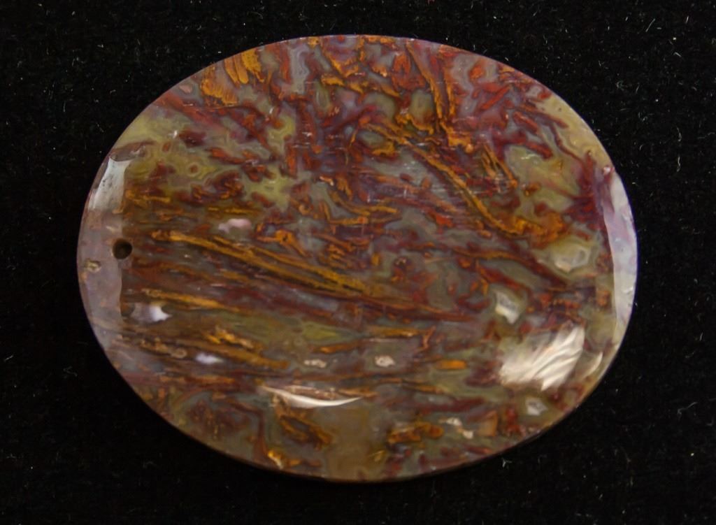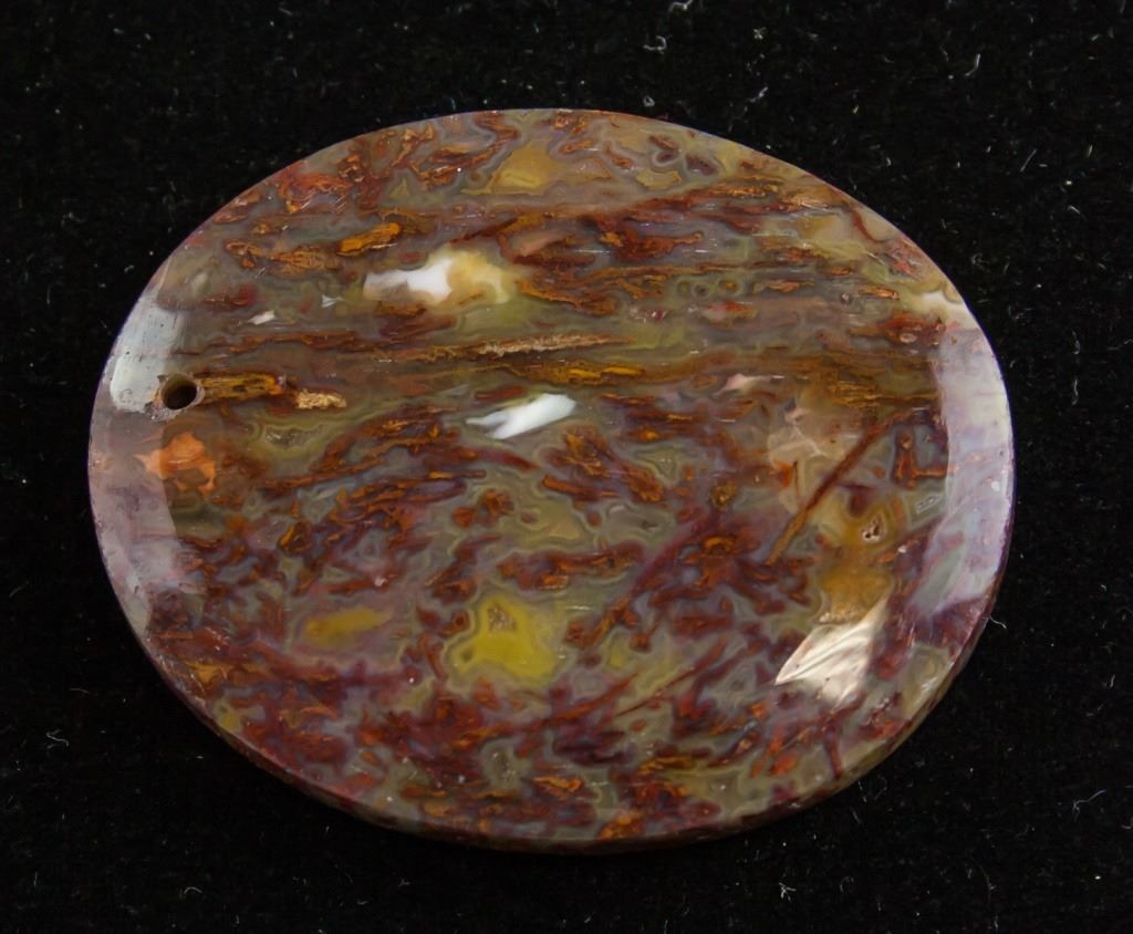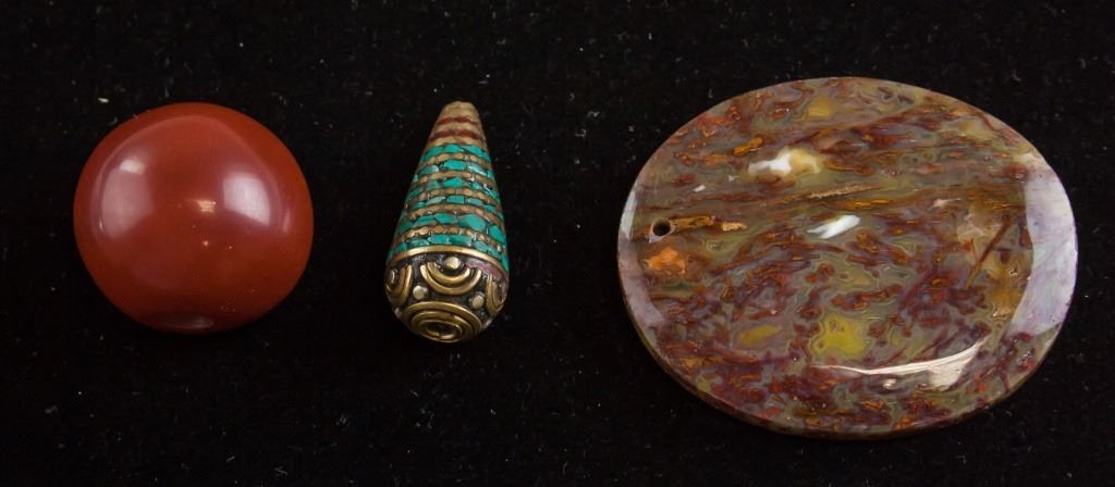 Lot of 3 Chinese pendants. One agate bead, one spindle-shaped bead, and one flat circular stone. 5 x 4 cm, 64g.