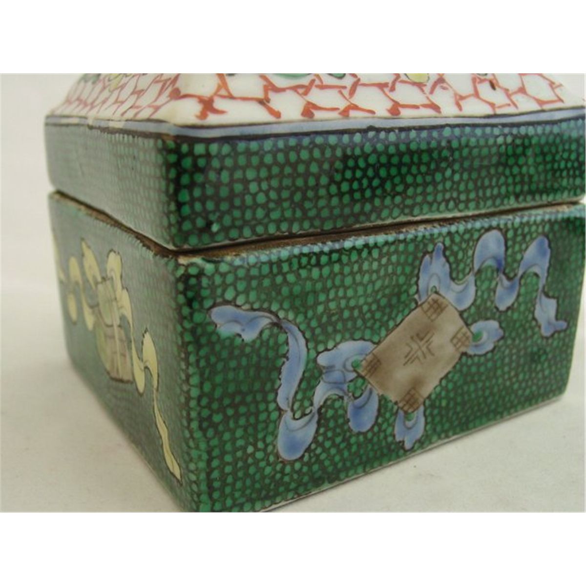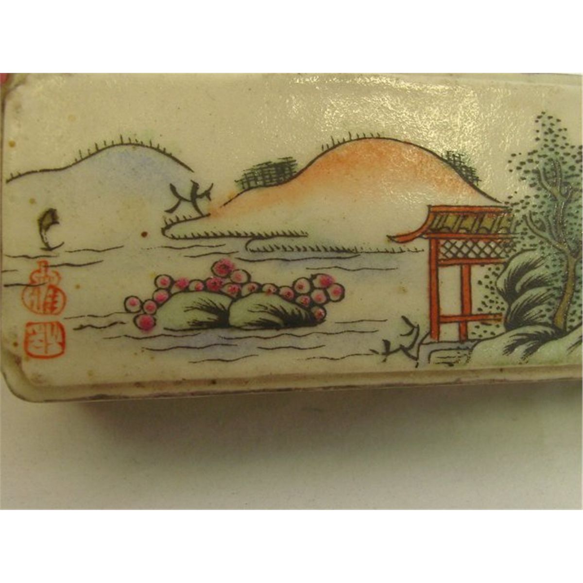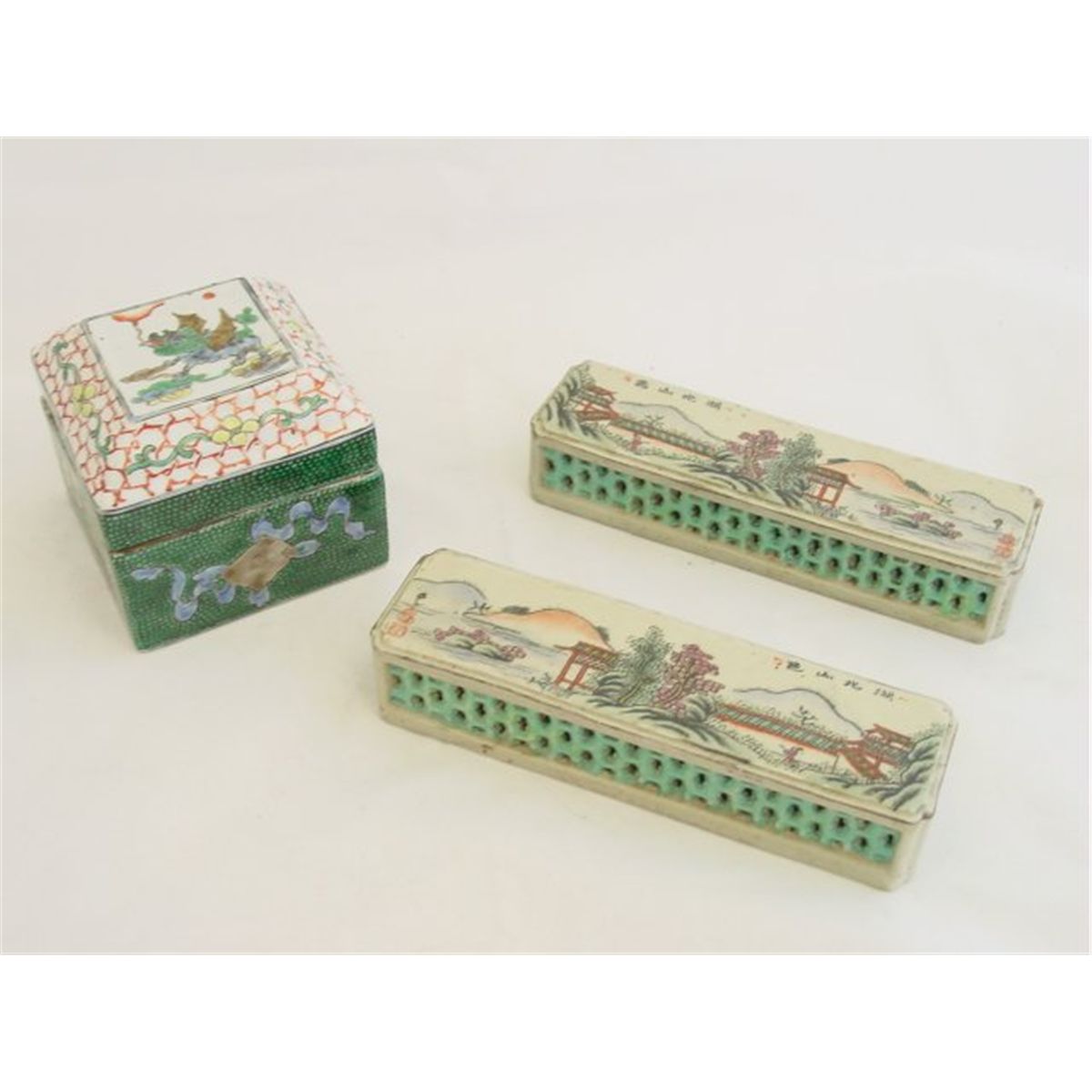 Pair porcelain painted weights, approx. 7" W x  1.25 H & a covered box, approx. 3.75" square. Please read our terms of sale.