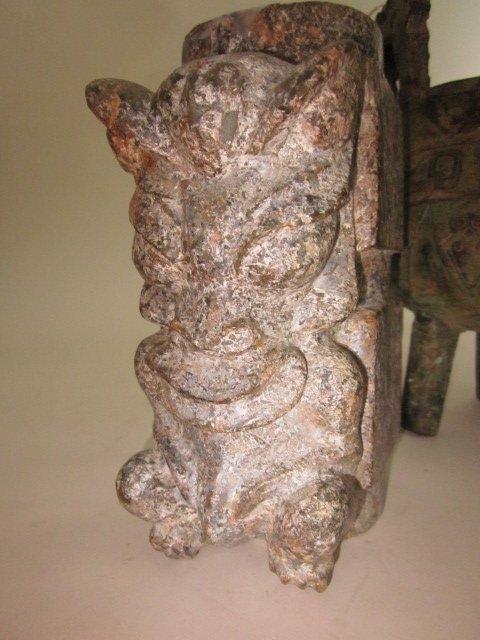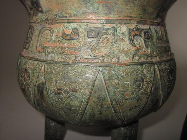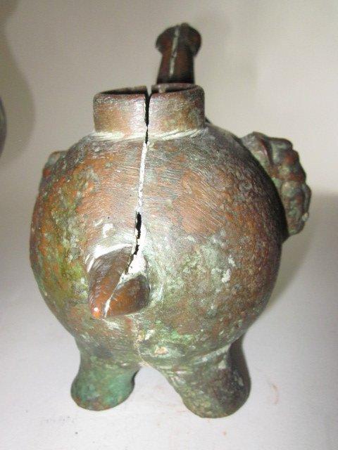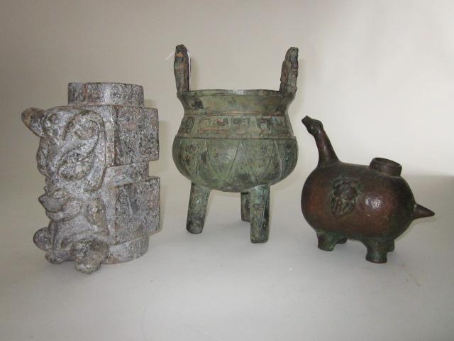Chinese bronze footed censer, Neolithic stone Tong & Chinese bronze vessel. Approx. 10" H x 6 1/4" W.