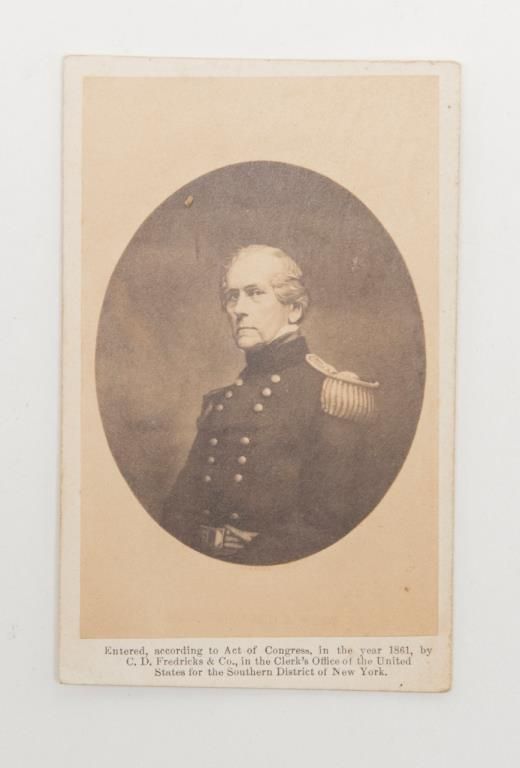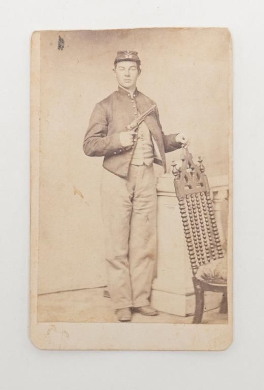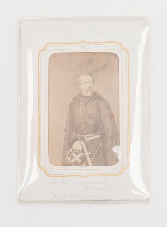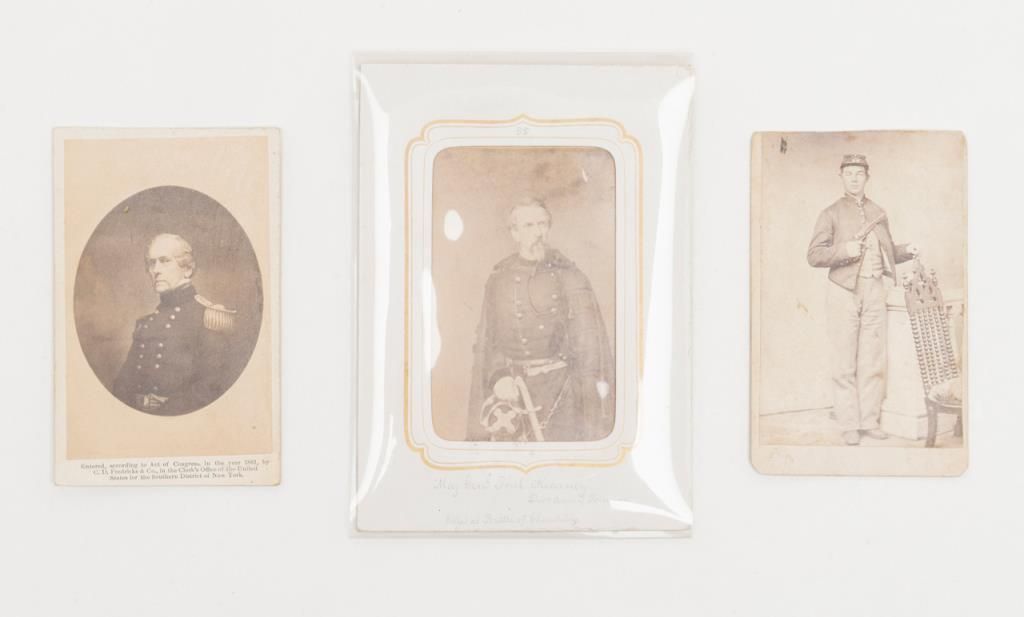 Lot of 3 Civil War CDVs, 1 of Major General Phillip Kearney (K.I.A. Battle of Chantilly), 1 of another Commanding Officer and 1 of an enlisted man holding a Colt Model 1860 Army revolver; all in good to very good condition. Est.: $100-$200