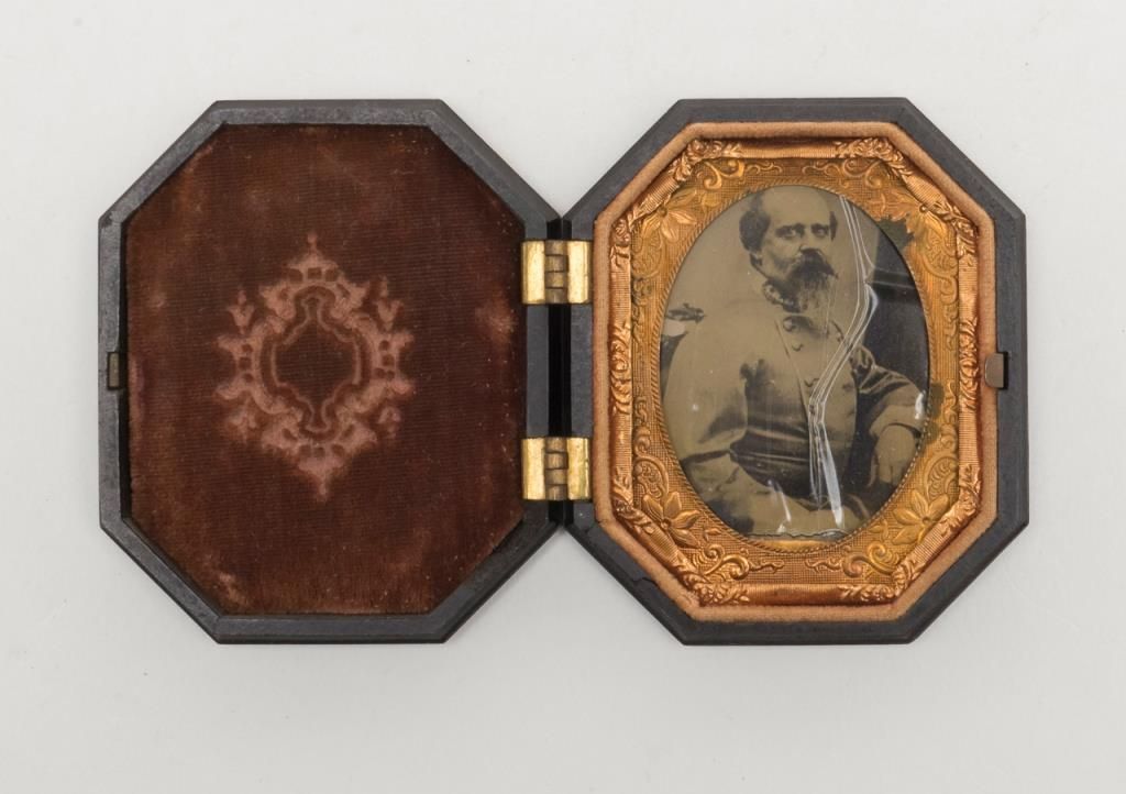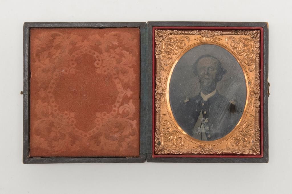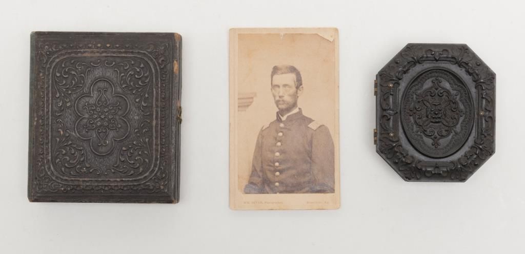 Lot of 3 Civil War era images, 2 in cases and 1 CDV of an un-named officer. The first cased image is of an officer in overall good condition with a blemished area to the lower right side; there is a lock of hair beneath the image in the case; thesecond image is in an octagonal Daguerreotype case with a chip on the lower left side but otherwise very good overall; the image is of an unidentified Confederate officer. Est.: $200-$400.