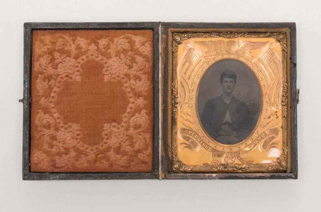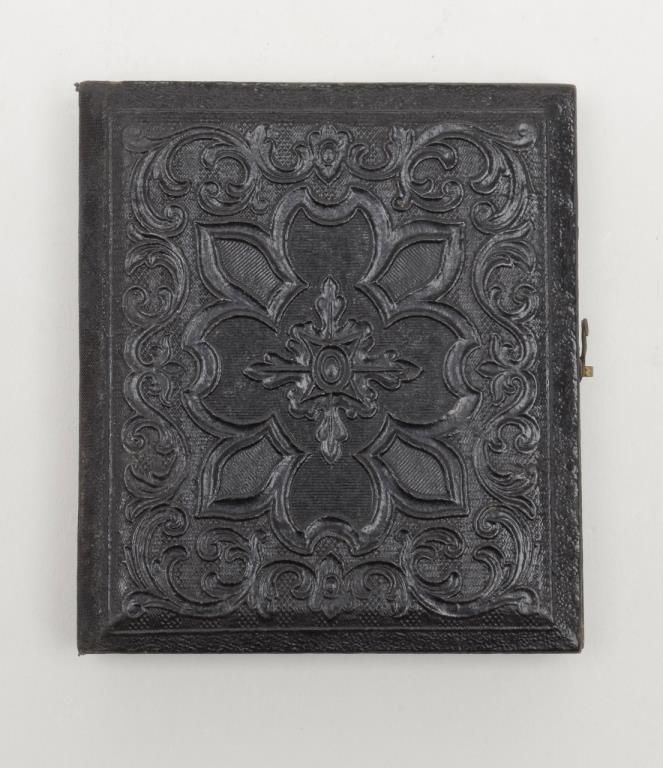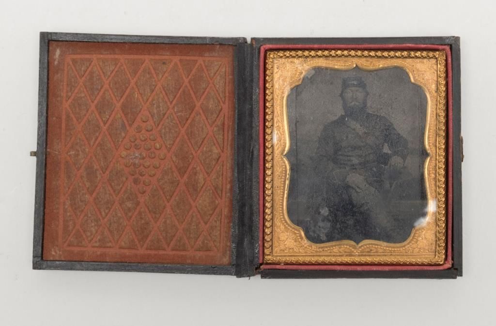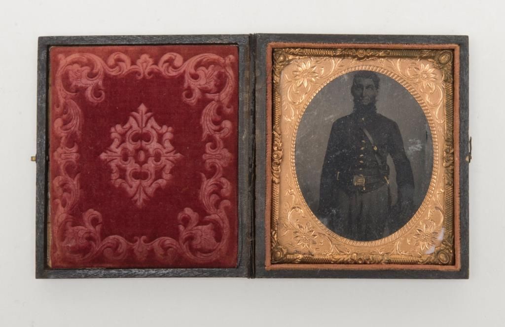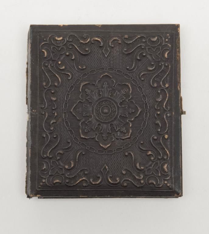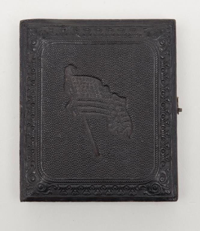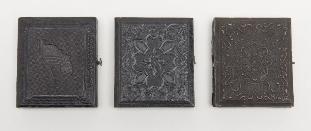 Lot of 3 Civil War era images, each in a case; the first being of a soldier in patriotic case with Union flag embossed on the front cover and spread eagle/flags, etc. on interior gold framing; overall very good condition. The second image isof a soldier in uniform with a wide eyed stare in overall good to very good condition, with the last image showing a bearded soldier, in uniform, with kepi, in overall good to very good condition. Est.: $250-$500.