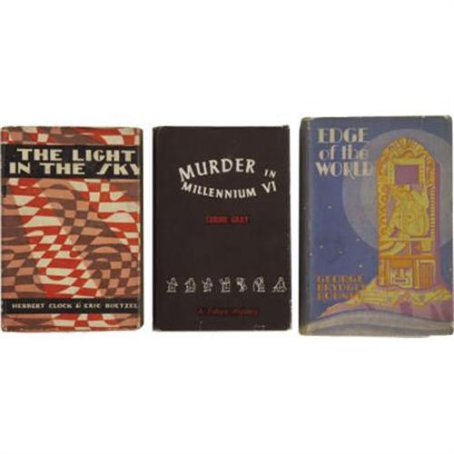 <B>Lot of Three Classic Science-Fiction First Editions, One Signed</B></I>, including: <B>Herbert Clock and Eric Boetzel. </B></I><B><I>The Light in the Sky</B></I></B></I>. New York: Coward-McCann, Inc., 1929. Twelvemo. 304 pages. Orange cloth with black titles. [and:] <B>George Brydges Rodney. </B></I><B><I>Edge of the World</B></I></B></I>. Duffield and Green [1931]. Octavo. 253 pages. Gray cloth with blue titles. [and:] <B>Curme Gray. </B></I><B><I>Murder in Millennium VI</B></I></B></I>. Chicago: Shasta Publishers [1951]. Twelvemo. 249 pages. The front endpaper is inscribed and signed by the author. Beige cloth with red titles. All three books, with dust jackets, are very good with some wear. <I>From the Robert and Diane Yaspan Collection.</B></I><BR><BR><b>Shipping:</b> Books & Catalogs (<a target="_blank" href="http://www.heritageauctions.com/common/shipping.php">view shipping information</a>)