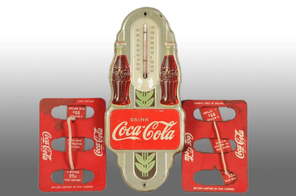 1940s. Includes two Coca-Cola masonite bottle carriers and one tin Coca-Cola thermometer. Both carriers include original rope handles. All pieces have some mild to medium overall wear, spots, stains, dents and edge rust. Condition (6.5 - 7.0, Very Good). Size Largest: 16" T.