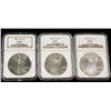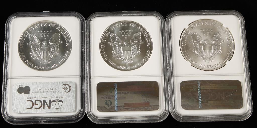 Graded by the NGC. (1) 1998 Eagle S$1 MS 69, (1) 1989 Eagle S$1 MS69, and (1) 2000 Eagle S$1 MS 69. All in protective cases.