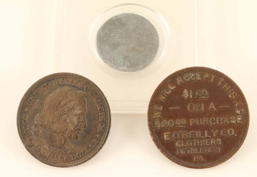 (1)Nazi GERMANY 1 Pfennig 1940 dated coin very dark poor condition (1)United States Columbian half dollar(1) E O'Reilly Co Clothiers Coin