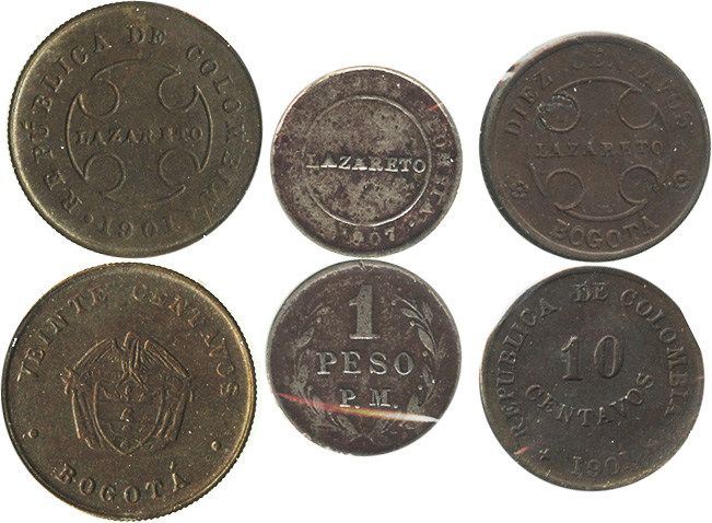 Lot of 3 Colombian miscellaneous minors for the Lazareto leper colonies: copper 20c and 10c 1901; copper-nickel 1 peso papel moneda 1907. 10.7 grams total. The two coppers are low-contrast XF; the 1907 is crude AVF with contrasting red-brown toning on fields; interesting lot for collectors of leprosy coins, which were struck under the mistaken premise that leprosy was contagious by handling money, which it is not, but furtherance of the idea caused many of the coins to be destroyed, making the survivors somewhat scarce.