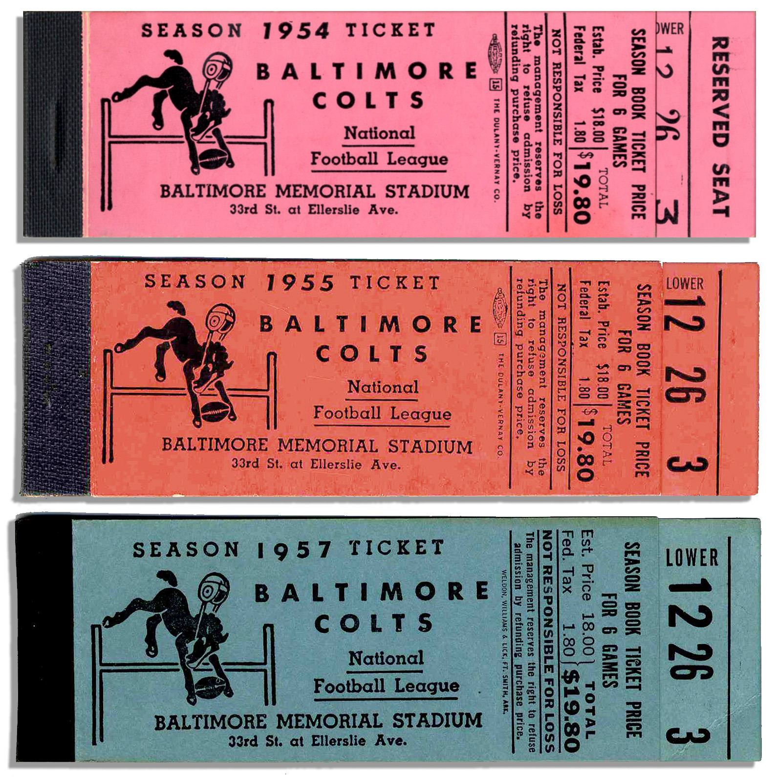Baltimore Colts season ticket books for 1954, 1955 and 1957. Each measures 5.5'' x 1.75''. The tickets for the seats in the lower section are absent but multicolor covers display nicely. Near fine overall.