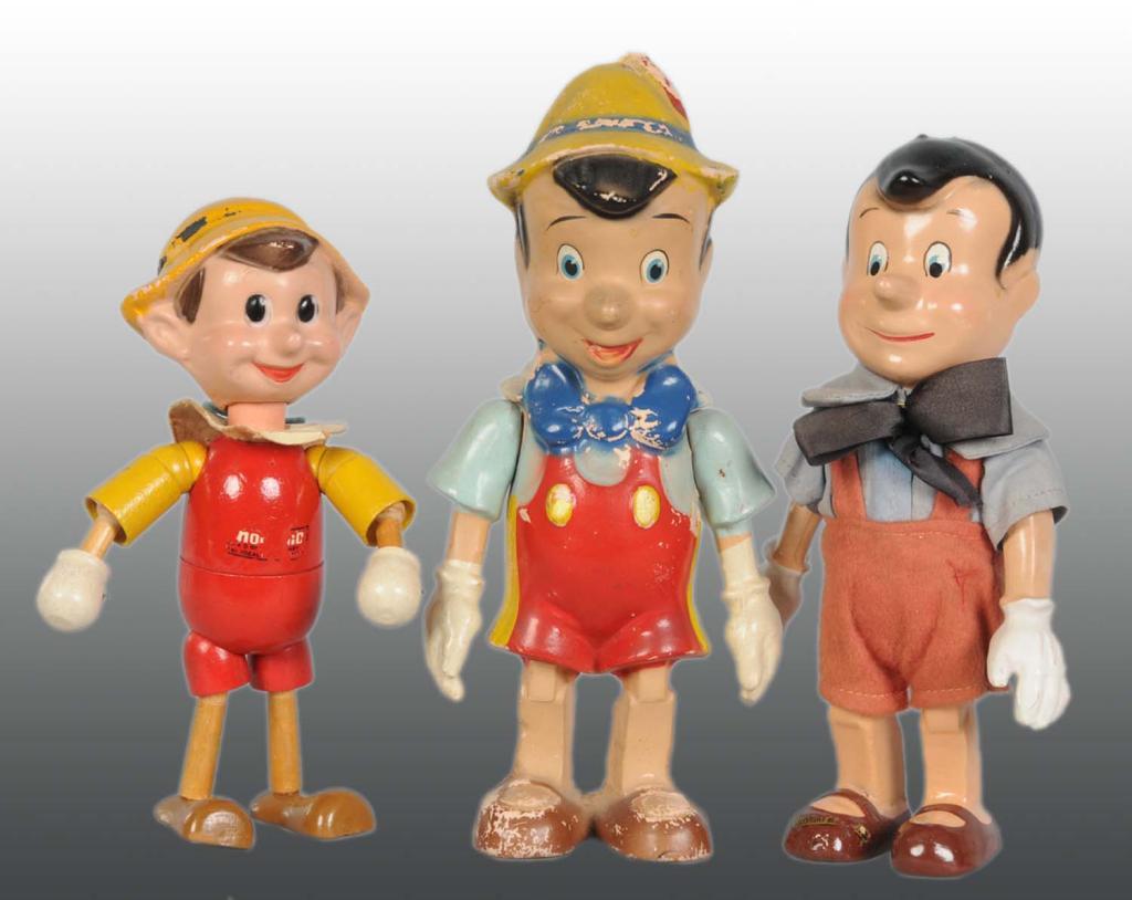 Includes one figure with movable arms, legs and head and two with movable arms only. All have moderate overall wear and paint loss but one has partial "Ideal Pinocchio" sticker on chest. Condition (Very Good). Size Largest: 8" T.