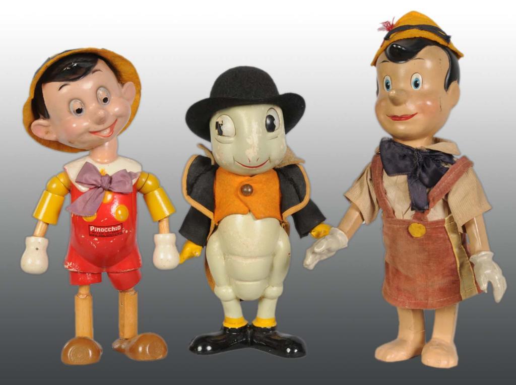 Includes one Jiminy Cricket and two Pinocchio figures. All have movable heads and arms while Jiminy Cricket's feet are not movable and the other two are. One Pinocchio is missing hat, one has "Pinocchio Ideal" label still present on front and all have moderate overall paint wear and loss with fading to clothes. Condition (Good - Very Good). Size All: 10" T.