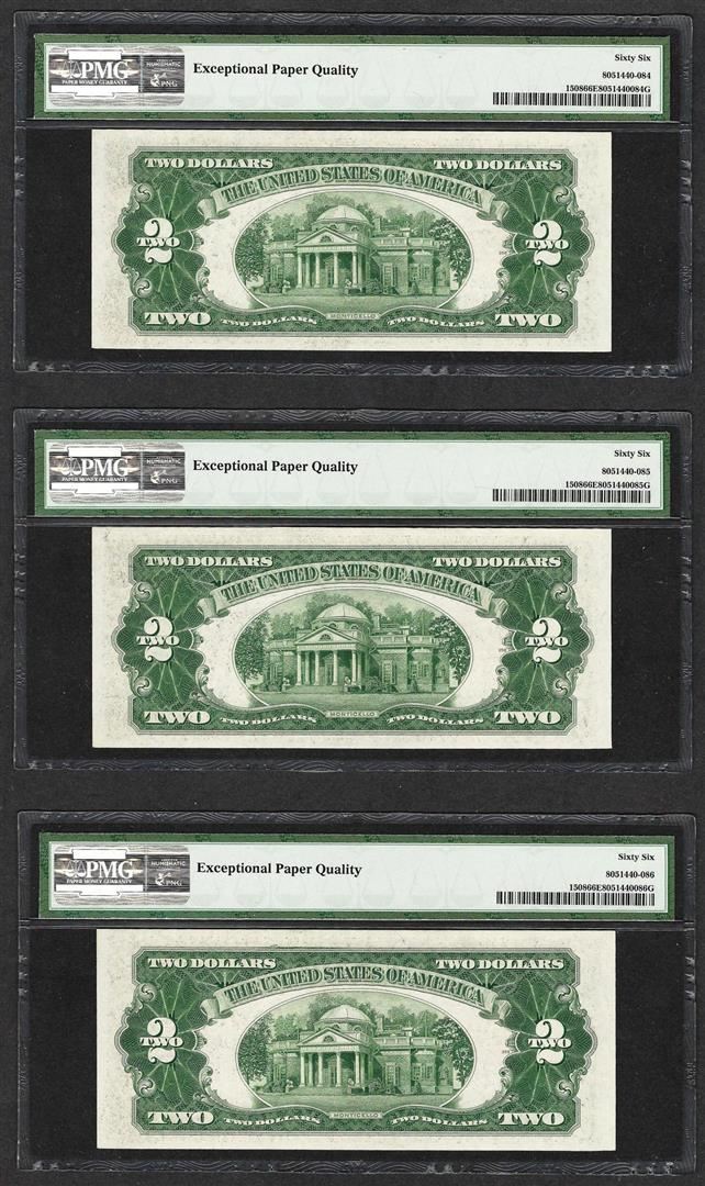 One Lot of (3) Consecutive 1928G $2 Legal Tender Notes Fr.1508 PMG Gem Uncirculated 66EPQ. PMG Certified.