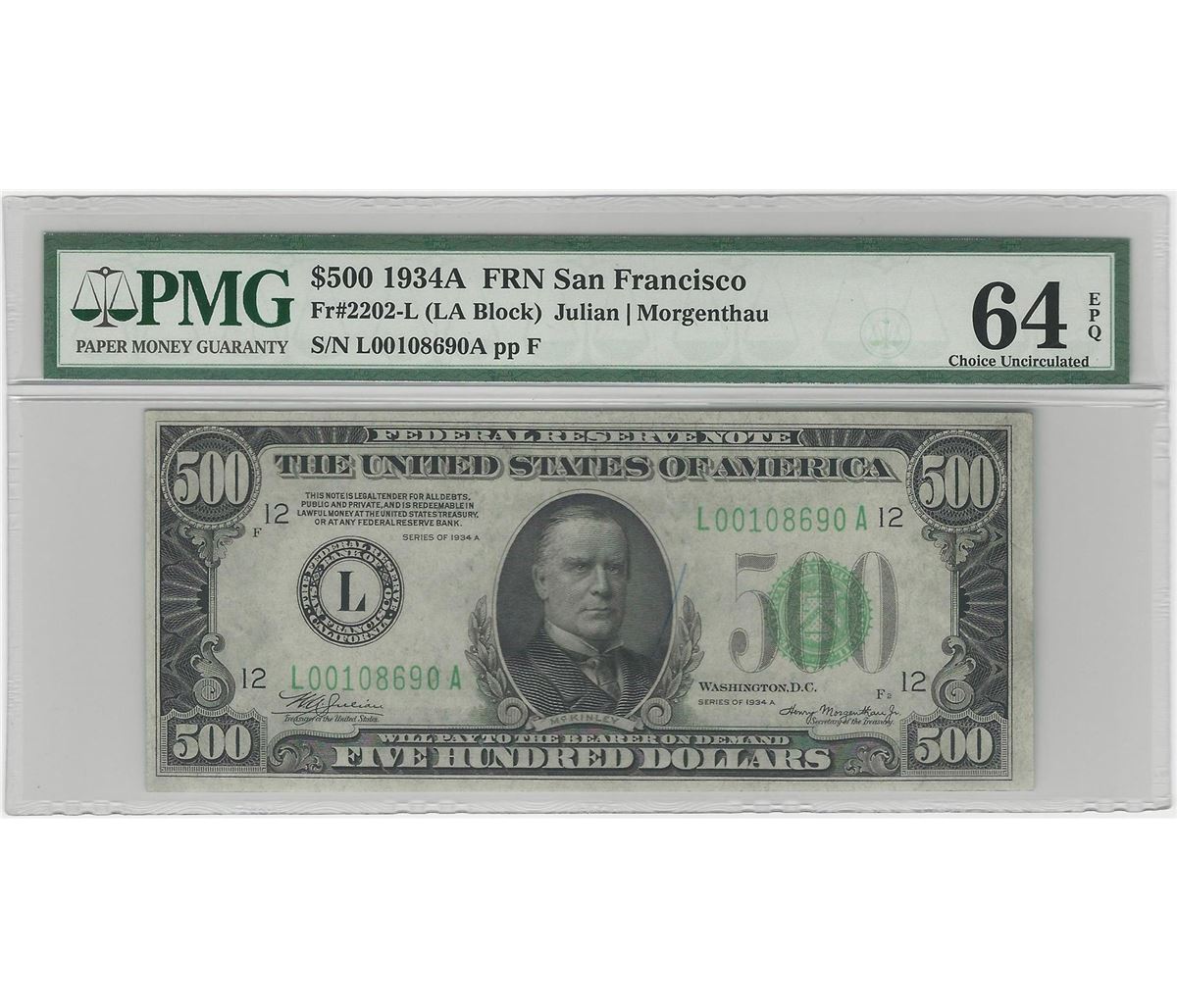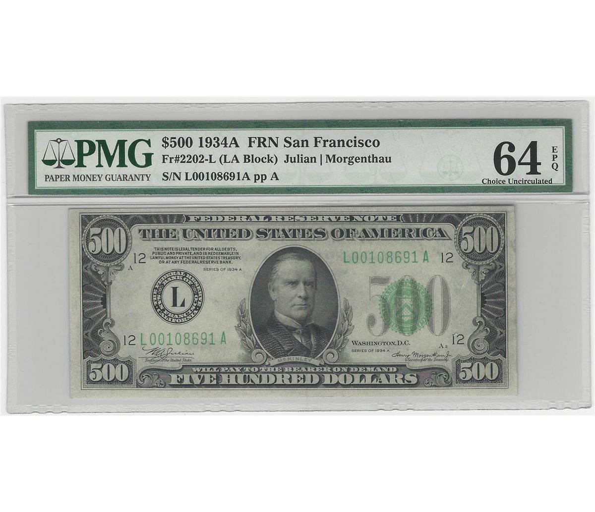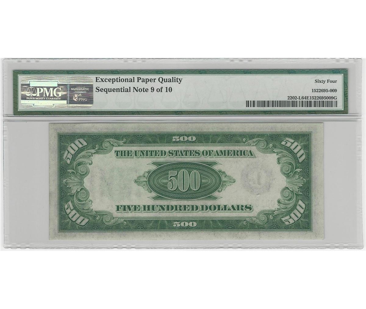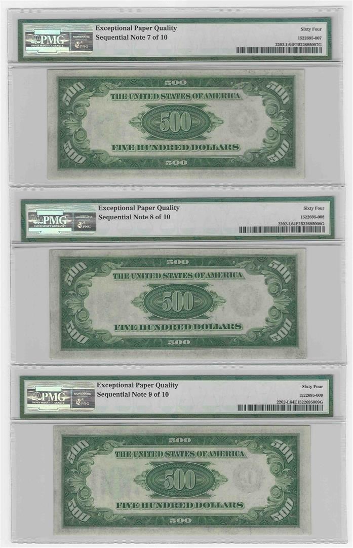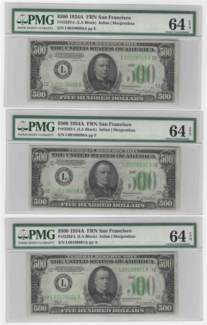 This lot of (3) 1934A $500 FRN Notes would be collectible by itself, however once you add in the fact that these notes are 3 consecutive serial #'s, and that they are excellent quality notes being graded PMG Choice Uncirculated 64EPQ, this set becomes very rare and will make an outstanding addition to any collection. PMG Certified.