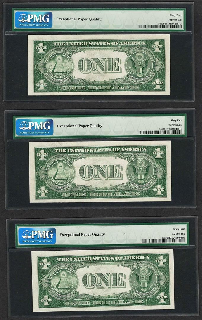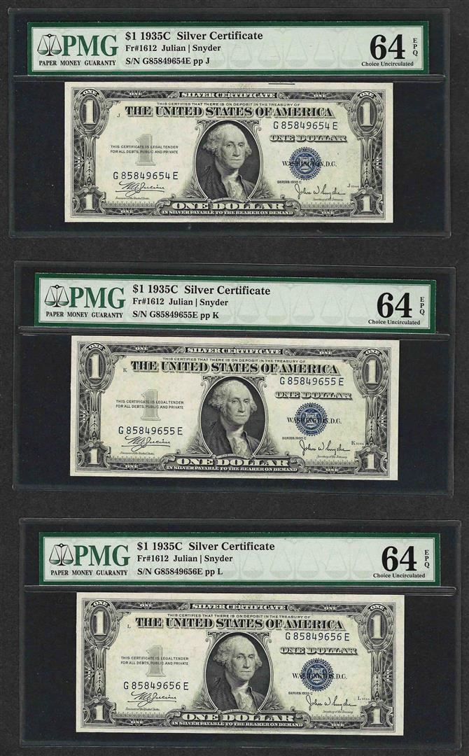 One Lot of (3) Consecutive 1935C $1 Silver Certificate Notes PMG Choice Uncirculated 64EPQ. PMG Certified.
