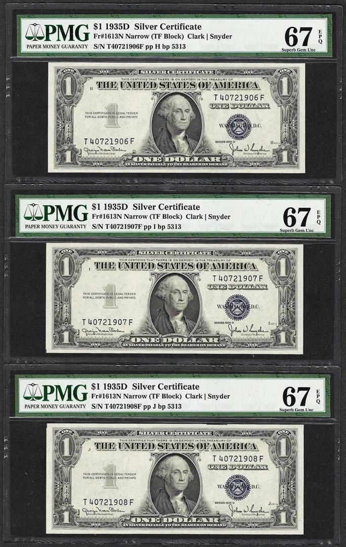 One Lot of (3) Consecutive 1935D $1 Silver Certificate Notes PMG Superb Gem Unc 67EPQ. PMG Certified.