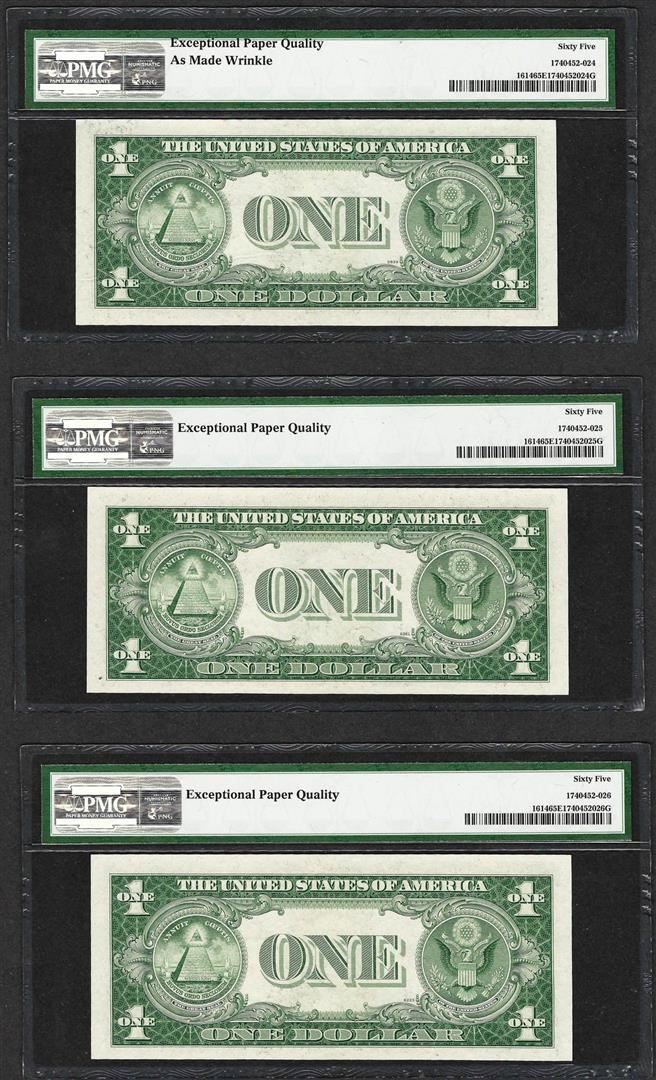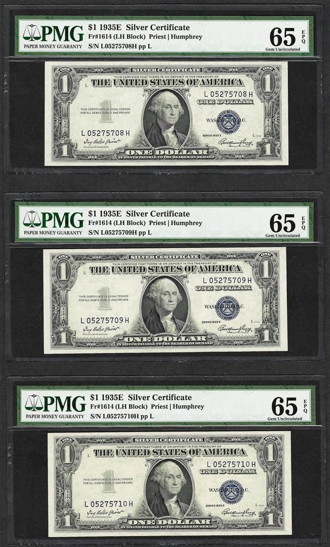 One Lot of (3) Consecutive 1935E $1 Silver Certificate Notes PMG Gem Uncirculated 65EPQ. PMG Certified.