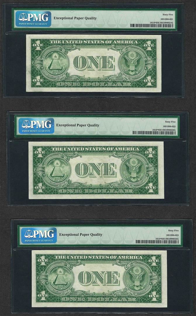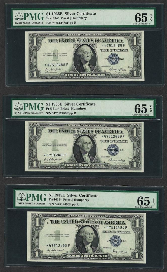 One Lot of (3) Consecutive 1935E $1 Silver Certificate STAR Notes PMG Gem Unc. 65EPQ. PMG Certified.