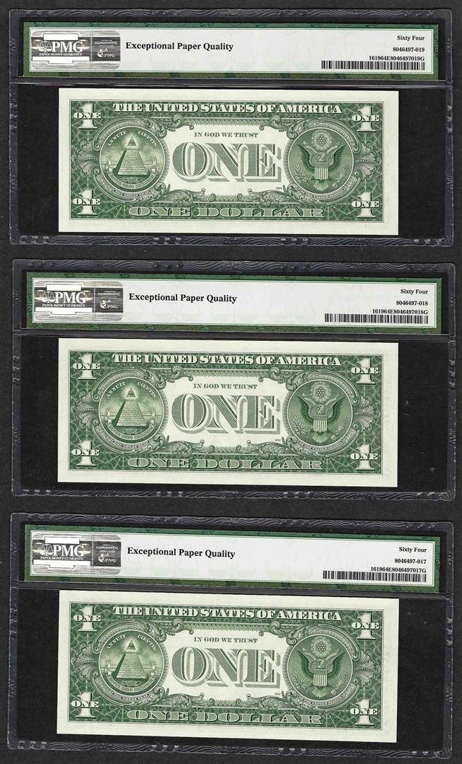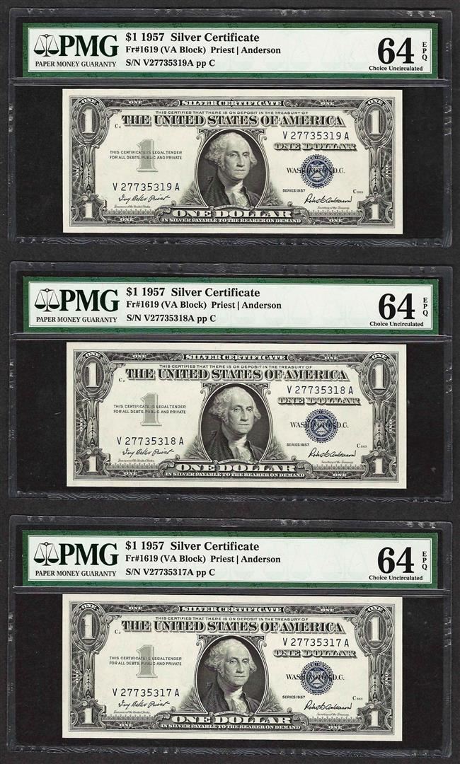 One Lot of (3) Consecutive 1957 $1 Silver Certificate Notes PMG Choice Uncirculated 64EPQ. PMG Certified.