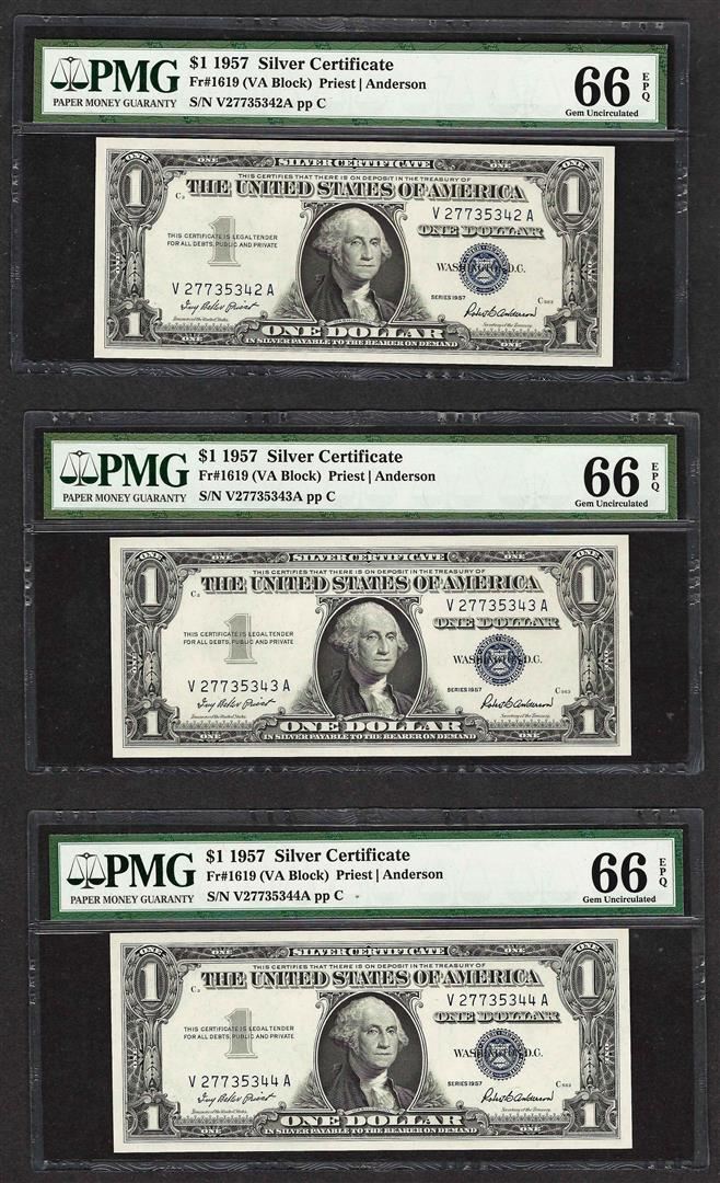 Lot of (3) Consecutive 1957 $1 Silver Certificate Notes PMG Gem Uncirculated 66E