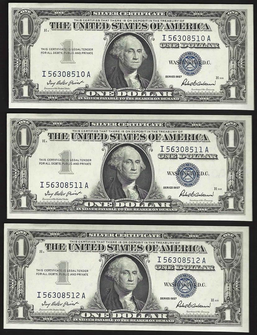 One Lot of (3) Consecutive 1957 $1 Silver Certificate Notes Uncirculated.