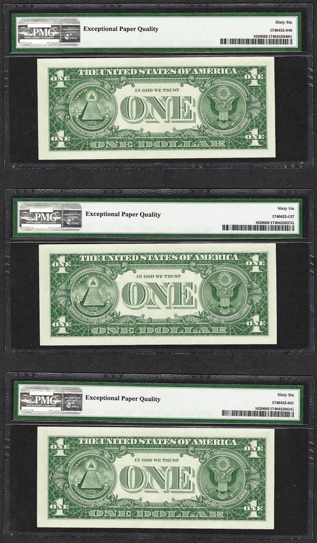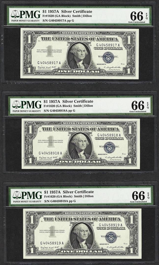 One Lot of (3) Consecutive 1957A $1 Silver Certificate Notes PMG Gem Uncirculated 66EPQ. PMG Appraised.
