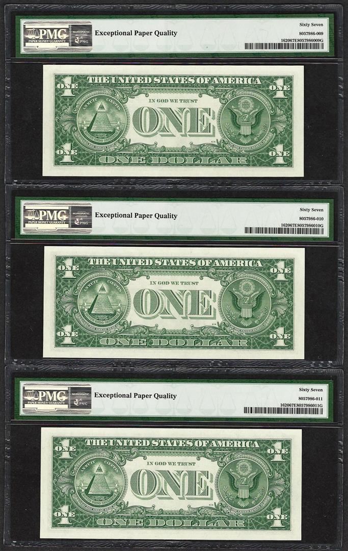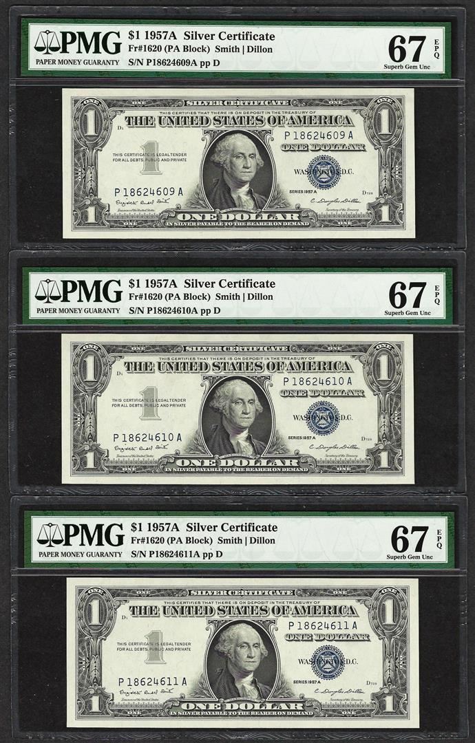 One Lot of (3) Consecutive 1957A $1 Silver Certificate Notes PMG Superb Gem Unc. 67EPQ. PMG Certified.