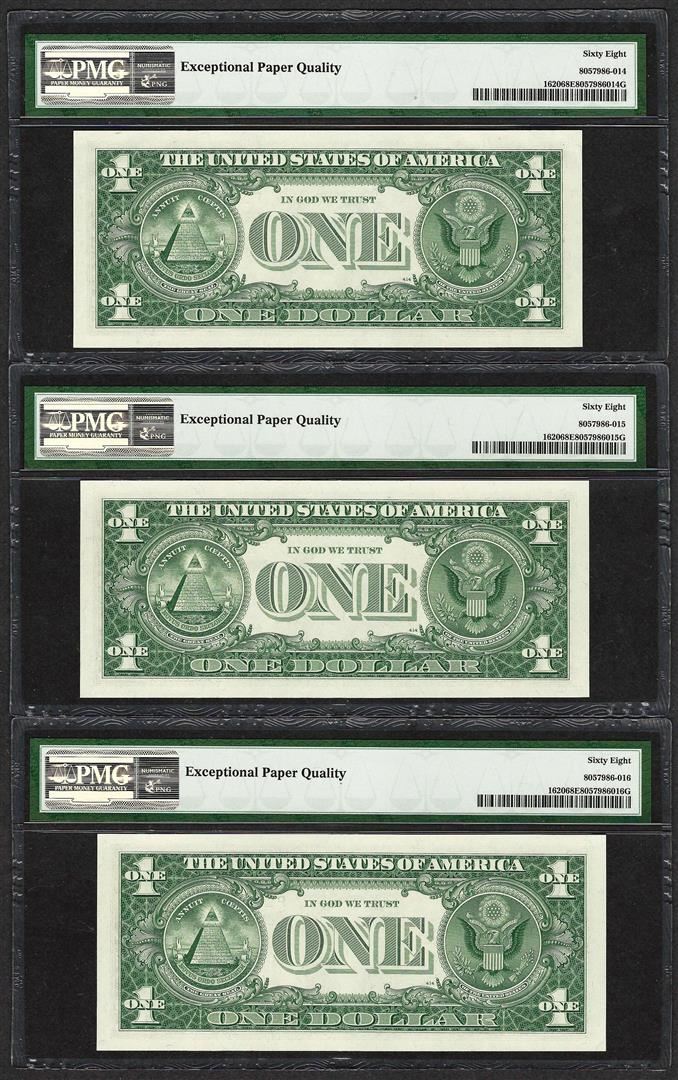 One Lot of (3) Consecutive 1957A $1 Silver Certificate Notes PMG Superb Gem Unc. 68EPQ. PMG Certified.