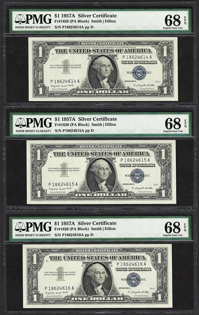 One Lot of (3) Consecutive 1957A $1 Silver Certificate Notes PMG Superb Gem Unc. 68EPQ. PMG Certified.