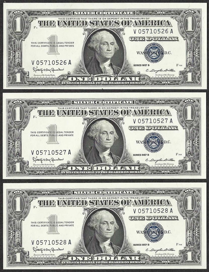 One Lot of (3) Consecutive 1957B $1 Silver Certificate Notes.