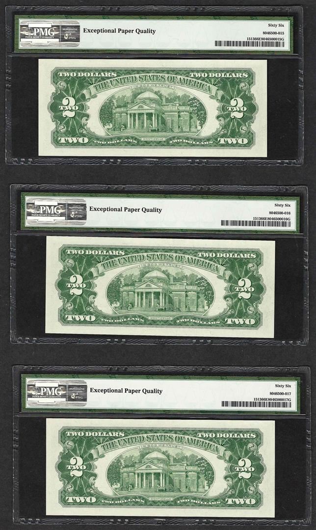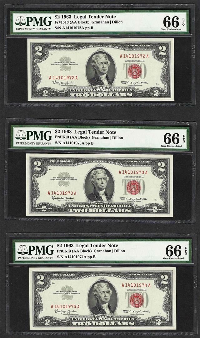 One Lot of (3) Consecutive 1963 $2 Legal Tender Notes Fr.1513 PMG Gem Uncirculated 66EPQ. PMG Certified.