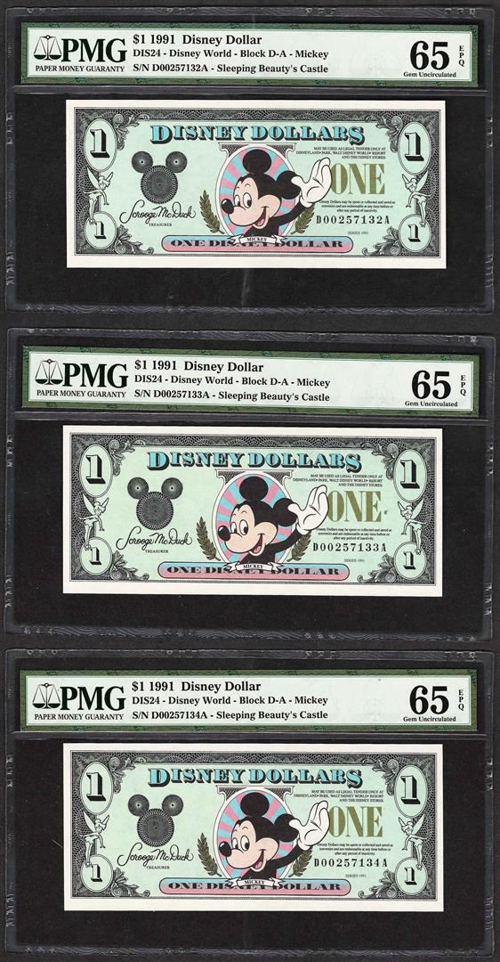 One Lot of (3) Consecutive 1991 $1 Disney Dollars Notes PMG Gem Uncirculated 65EPQ.