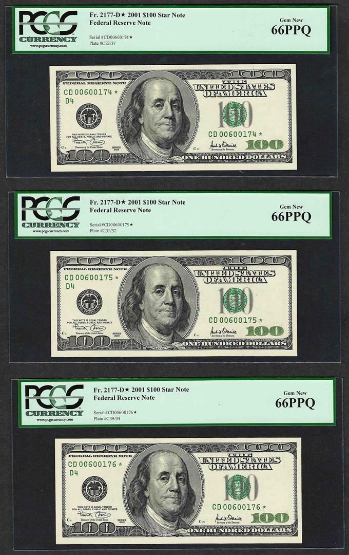 Lot of (3) Consecutive 2001 $100 Federal Reserve STAR Notes PCGS Gem New 66PPQ