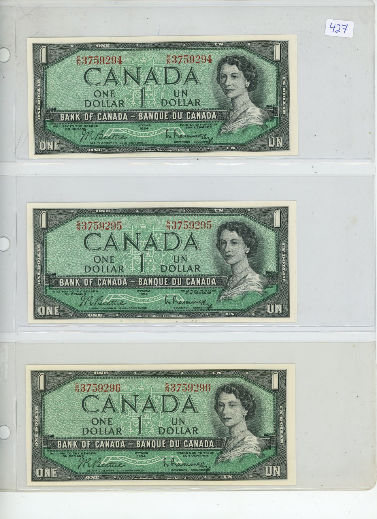 Lot of 3 Consecutive Serial Number 1954 Modified Portrait $1 notes. Beattie-Rasminsky signatures. S/N Prefix. Serial Numbers 3759294, 3759295 & 3759296.