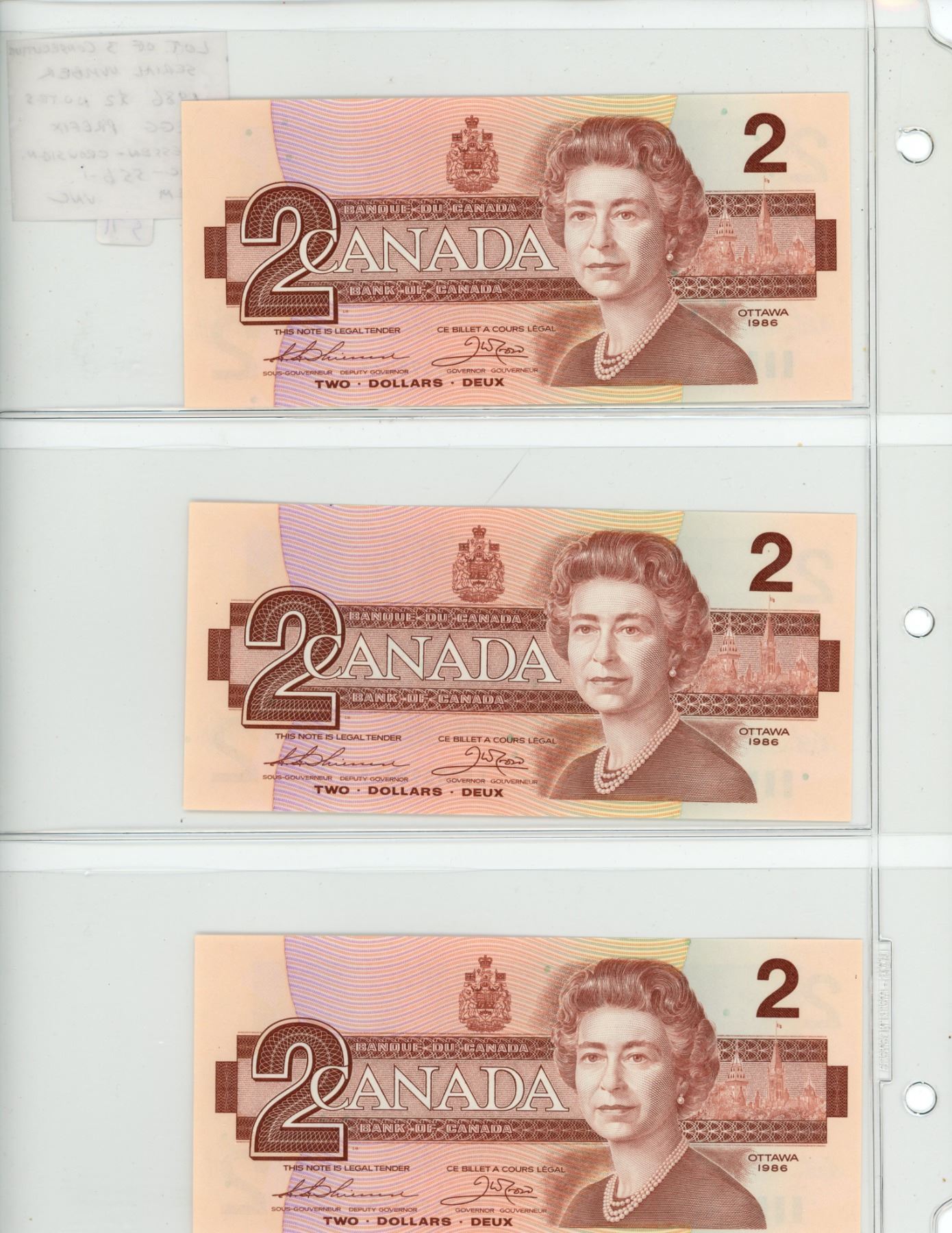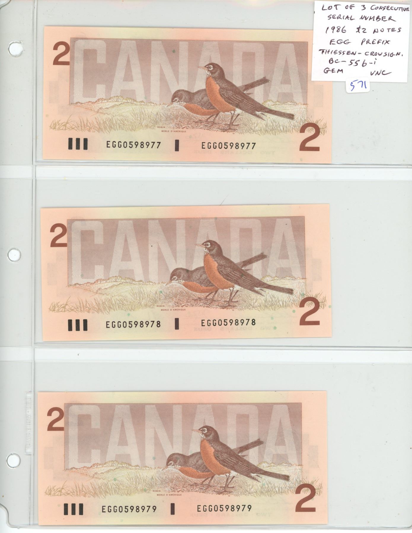 Lot of 3 Consecutive Serial Number 1986 $2 notes. Thiessen-Crow signatures. EGG Prefix. BC-55b-i. Gem Uncirculated.