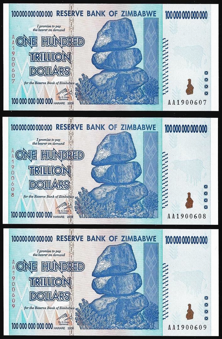 One Lot of (3) Consecutive Zimbabwe One Hundred Trillion Dollar Notes.