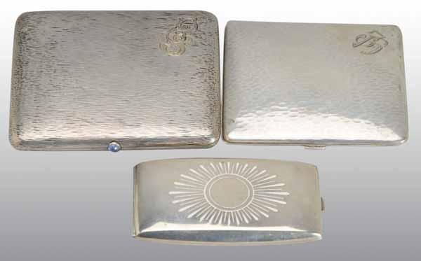 Description Weighs 8.3 troy ounces. Includes two rectangular cases with a textured finish, one rectangular case with tapering edges, and one with a stylized sunburst in white enamel. Condition (Very Good). Size Largest: 3 - 7/8" L.