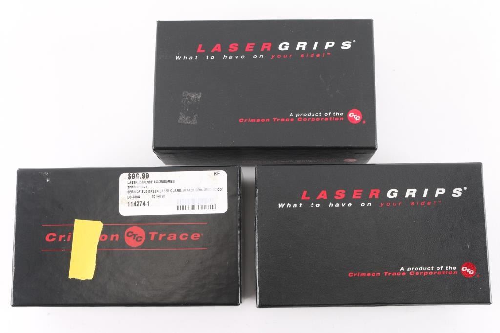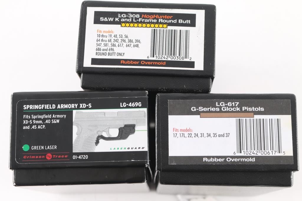1 : Crimson Trace trigger guard green laser Model LG-469G. Fits Springfield Armory XD-S 9mm, .40 S&W and 45acp. 1/3N 3V lithium battery. Feb. 17 production date. Used item but like new. 2 : Crimson Trace Smith & Wesson revolver K and L frame rubber overmold grips with red laser. Model LG-308 CR2023 battery. Fits models 10 thru 19,48,53,56,64 thru 68,242,296,386,396,547,581,586,617,647,648,686 and 696. Round butt frame only. Like new condition.