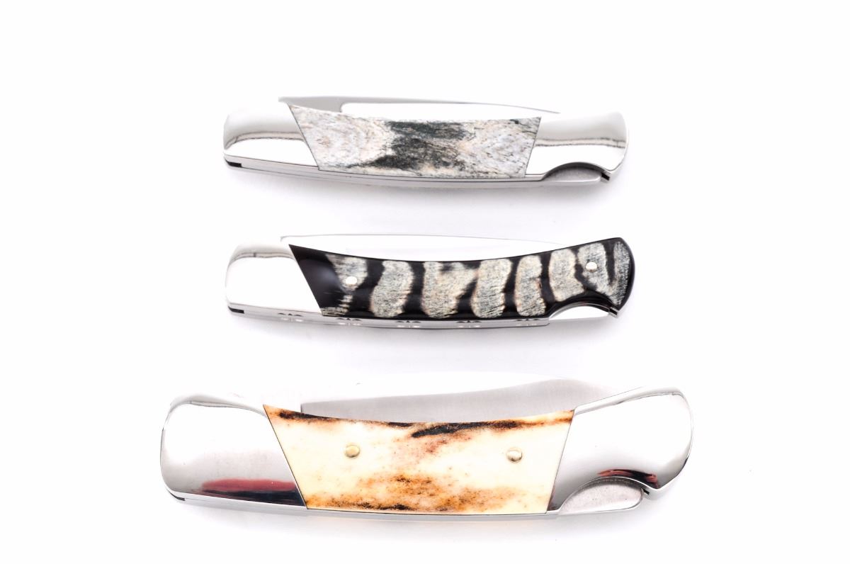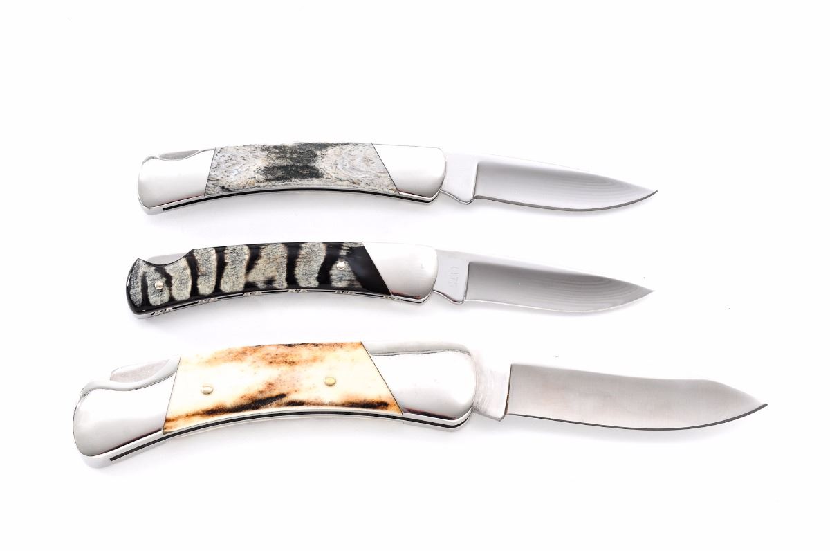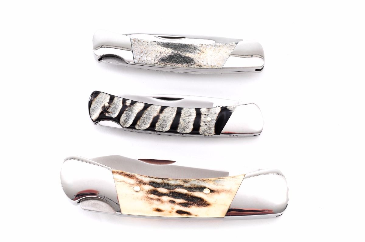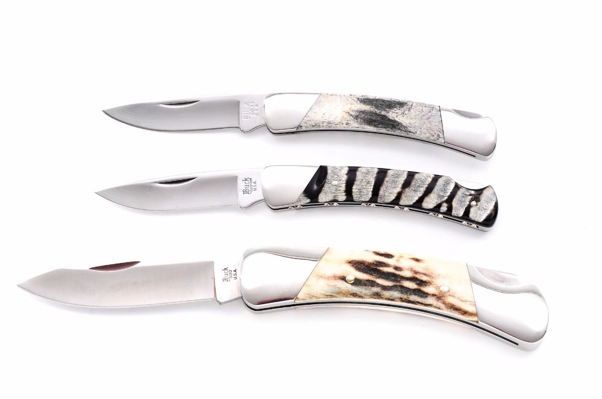 Lot of Three (3) Custom Feature Buck Folding Knives: (1) Model 500 Lockback Folding Knife, 3'' blade, 4-1/4'' overall closed length, mirror polished blade and bolsters, with sandbar stag grips. Blade with italic Buck stamp. Condition is near excellent showing no signs of use. Bolsters with light to moderate scratches. (2) Model 503 Prince Lockback Folding Knife, 2-3/8'' blade, 3-3/8'' closed length, mirror polished blade and bolsters, with impala horn grips. Frame with light file work to top and bottom edge. Blade is marked ''0175''. Consignor states that he had it made in 1987. Condition is excellent showing no signs of use. Bolsters with light to moderate scratches. (3) Model 503 Prince Lockback Folding Knife, 2-3/8'' blade, 3-3/8'' closed length, mirror polished blade and bolsters, with moose antler grips. Mfg'd 1987. Condition is excellent, appearing as new, showing no signs of use. Bolsters with light micro-scratching. Est.: $300-$500/lot.