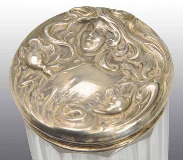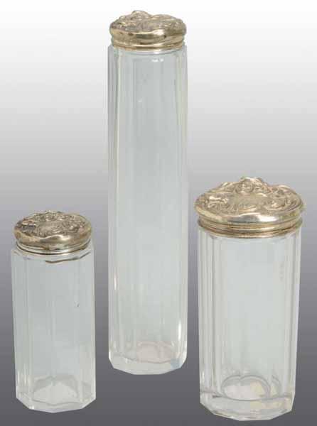 Description All matching Art Nouveau sterling lids. Smallest bottle with one base chip. Condition (Excellent). Size Largest: 7" T.
